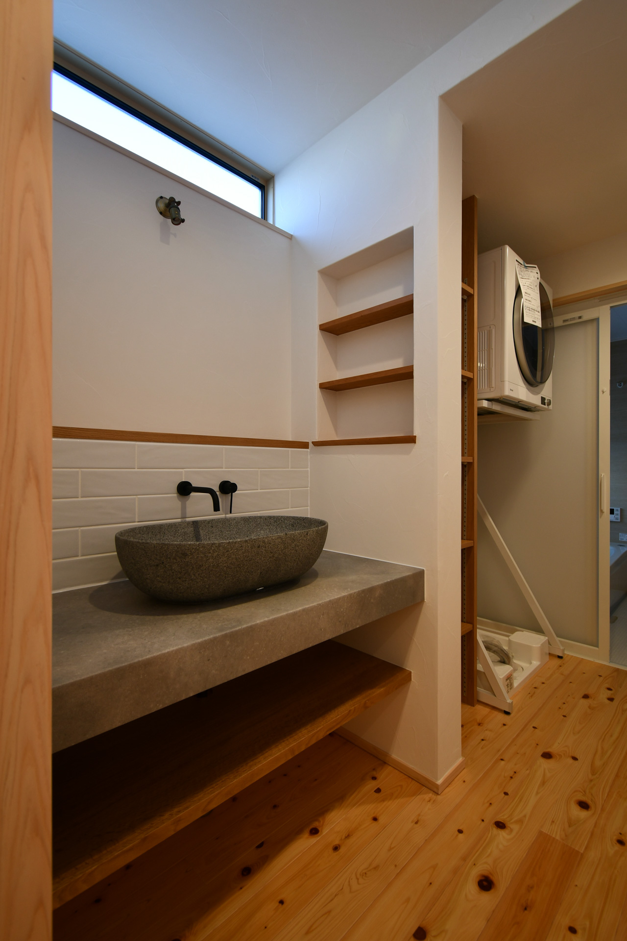 - 落ち着きのある洗面は幅を広くつくり、収納もたっぷりで使いやすい