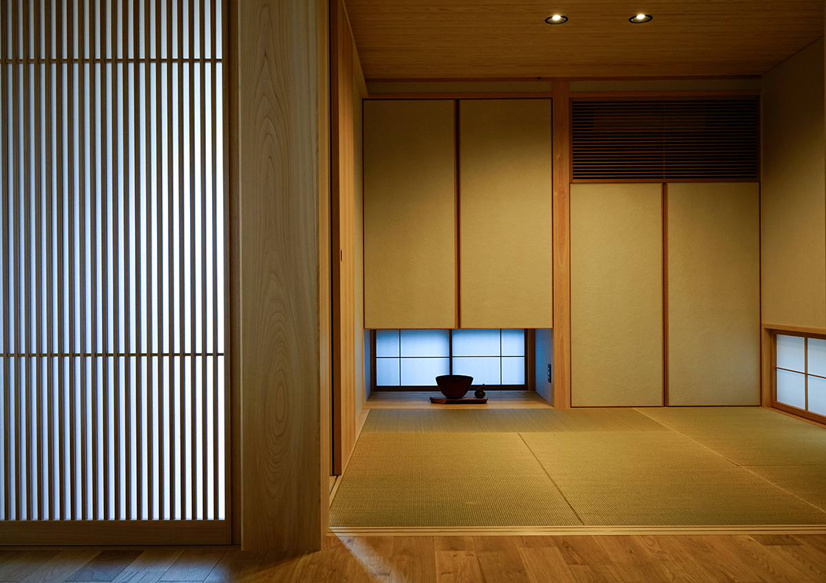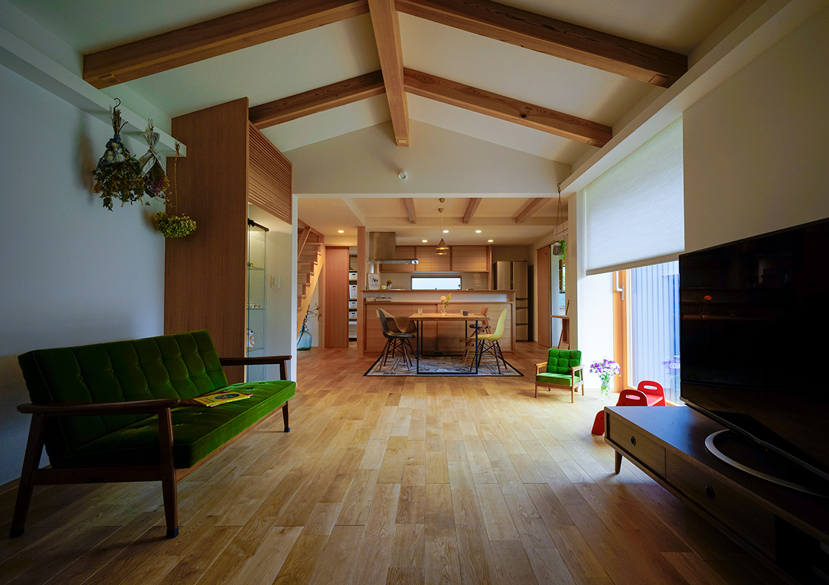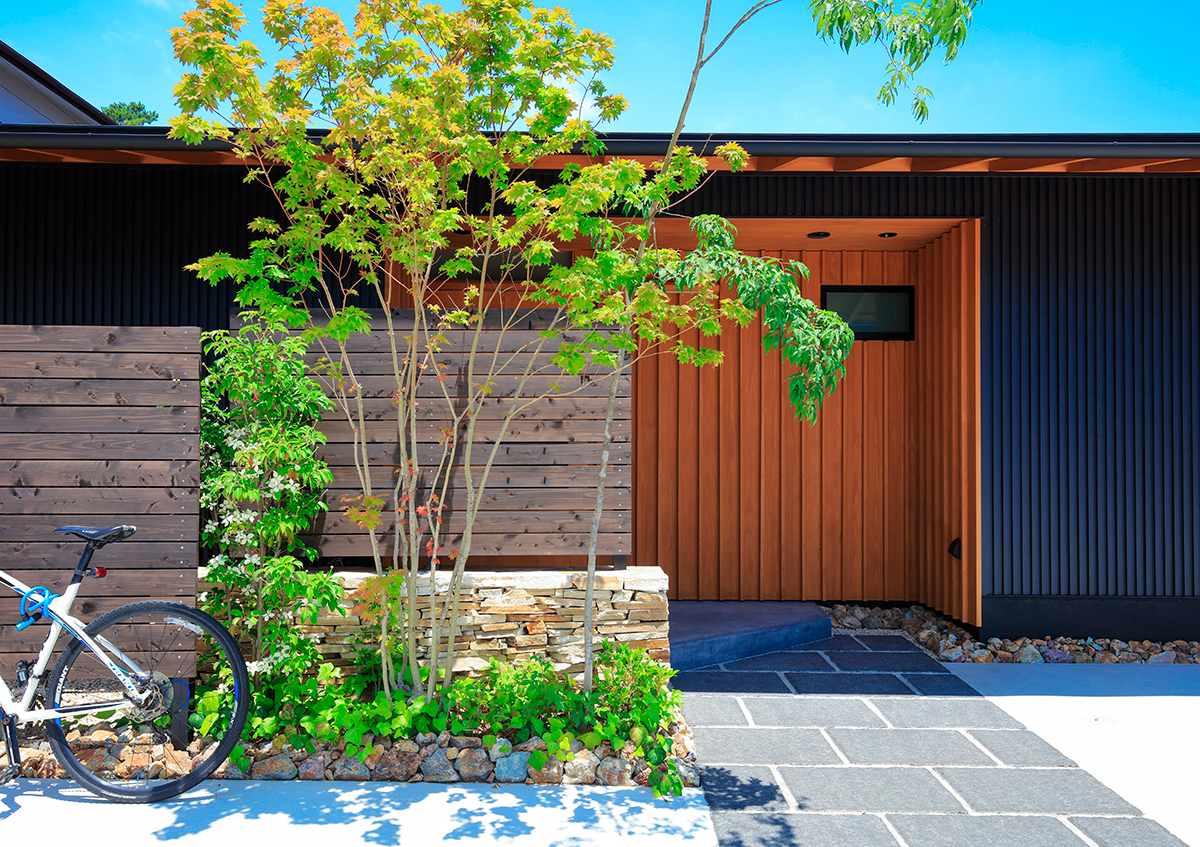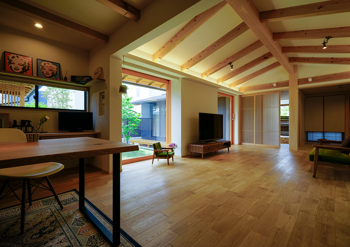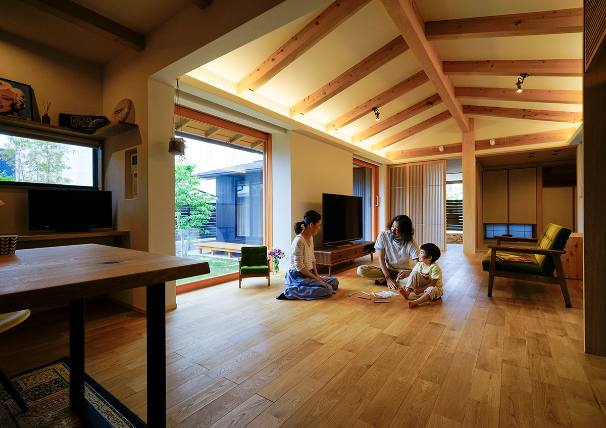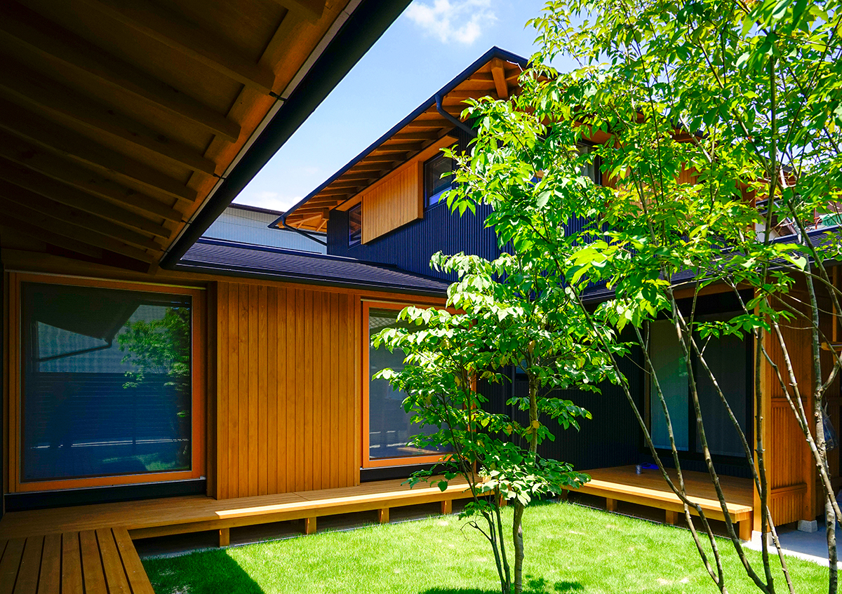 街中の交通量の多い前面道路からの音や視線を遮りのんびりと過ごすことができるように中庭を設け、建物をコの字形状にしました。また敷地は南北軸に45度に振れており、南東側に3階建ての家もあることから、最大限リビングやダイニングに日射が入るように、部屋の位置や窓の位置を検討しました。二階建てではありますが、子供部屋のある二階は道路からなるべく距離を取ったことで平屋にも見えます。