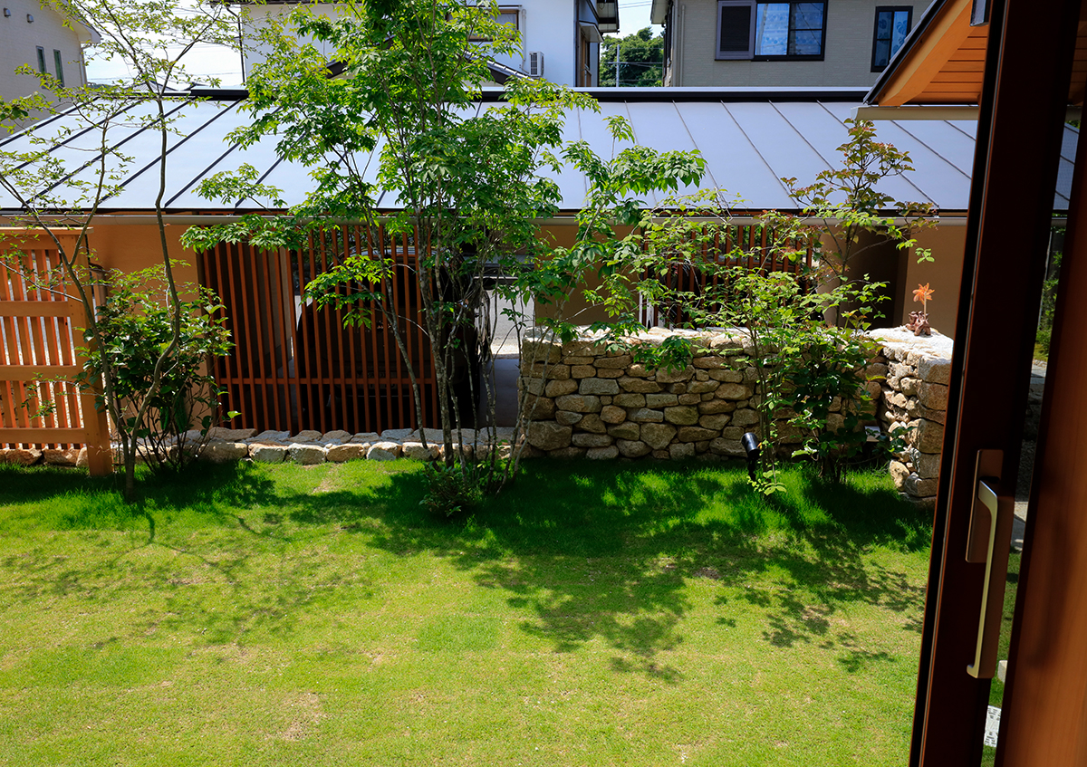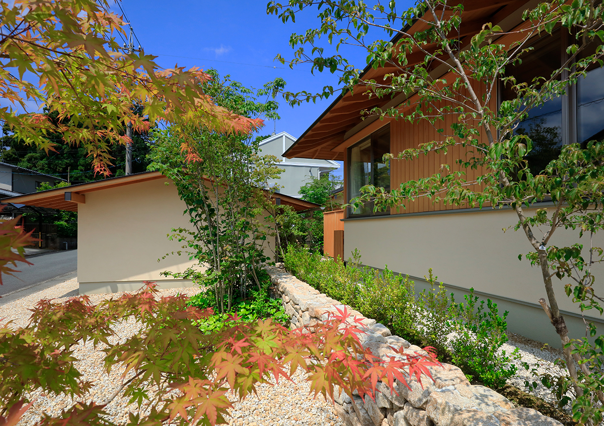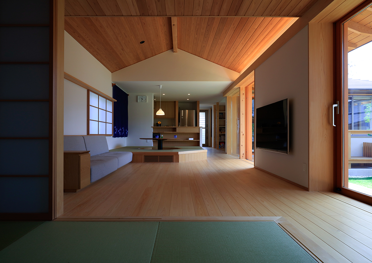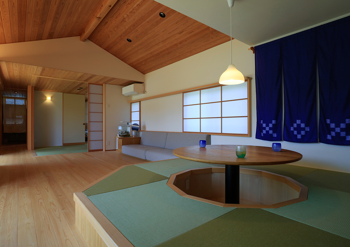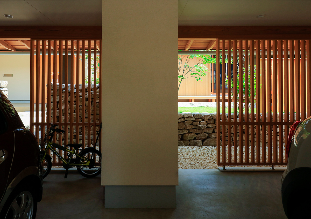 周囲の視線を感じることなく、家族全員で楽しく暮らす「悠結のイエ」。敷地の工程差を利用した配置計画により、道路からの視線をガレージの木製面格子により緩やかに遮りつつも、住まいとガレージの間にできた中庭が開放感を生み出しました。広い敷地を利用し、北側に小さな庭を設けることで、寝室や家事室からも庭を眺めることができ、ほっと安らぎを与えます。室内はコンパクトながらも、建具を開くとすべての居室は一体に広く使用することができ、造付けソファや丸テーブルの掘りごたつを設けることにより、各々の居場所を確保しました。家族どうし、そして家の中と外の間に自然と一体感が生まれる、平屋ならではのシンプルで心豊かな住まいを実現しました。(第25回住まいの文化賞最優秀賞)