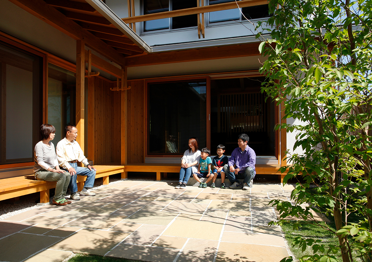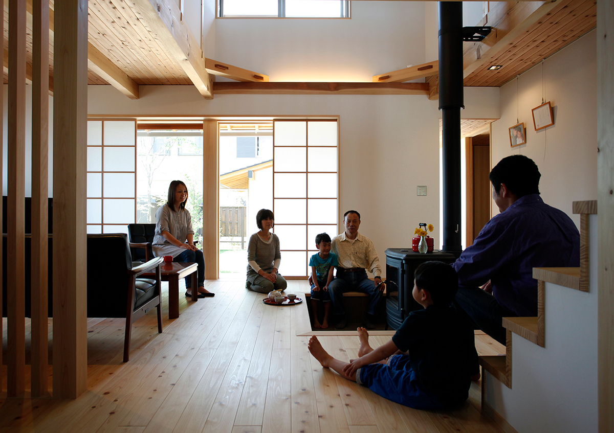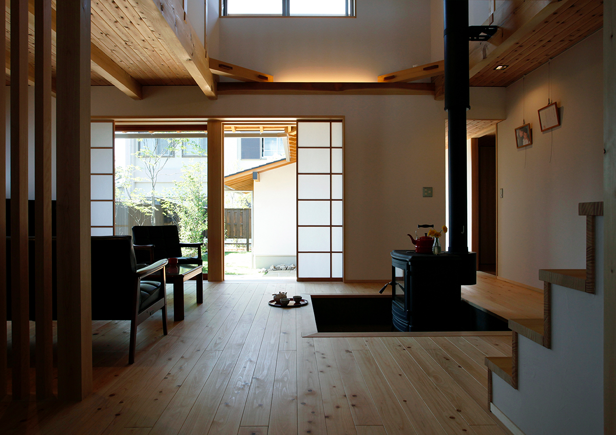 間口9.6mの南北に長い敷地に建てた2世帯住宅です。東側を開放し、光と風を入れることができるように中庭を設けました。ここでは充実にみんなでバーベキューができます。またリビングには薪ストーブがあり、家族が自然に集まって楽しく過ごせる場としました。