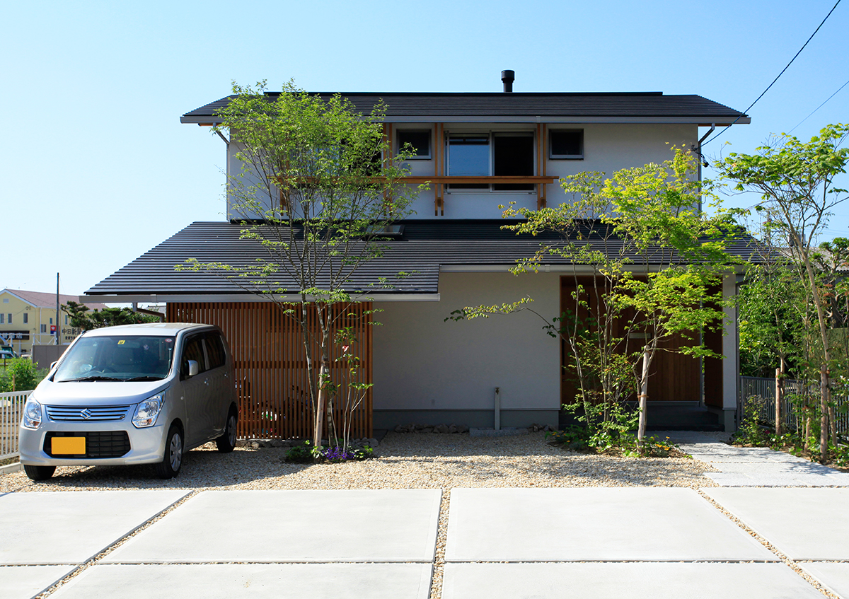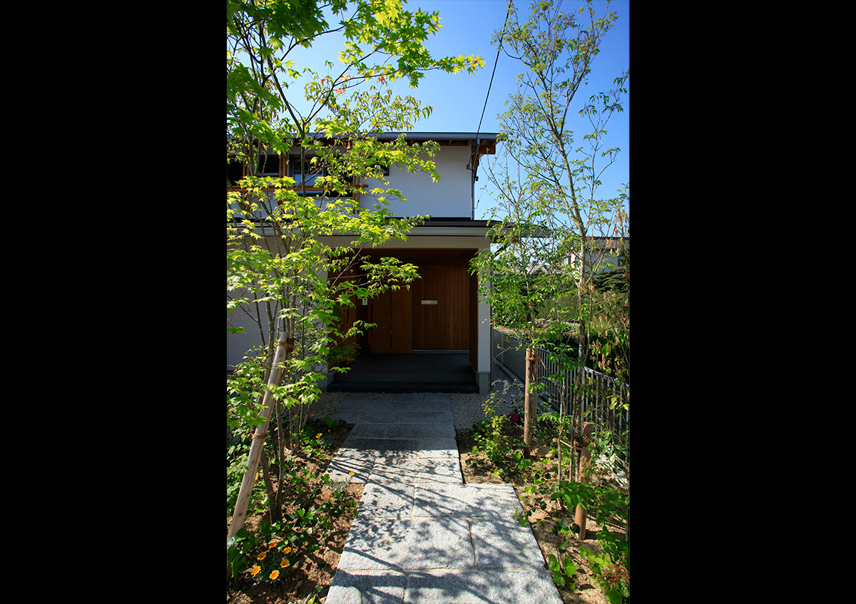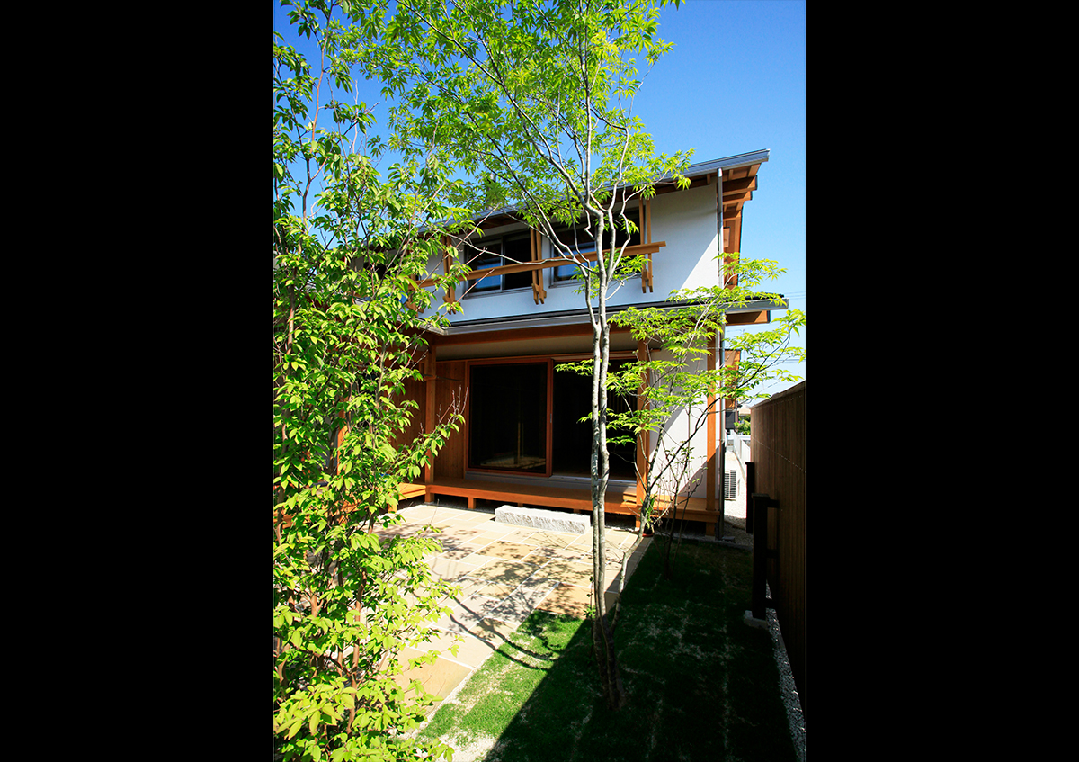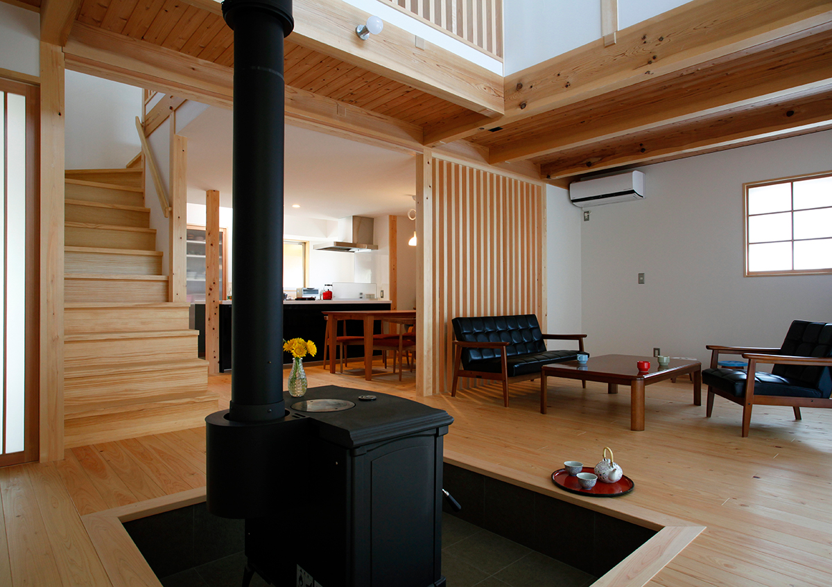 間口9.6mの南北に長い敷地に建てた2世帯住宅です。東側を開放し、光と風を入れることができるように中庭を設けました。ここでは充実にみんなでバーベキューができます。またリビングには薪ストーブがあり、家族が自然に集まって楽しく過ごせる場としました。