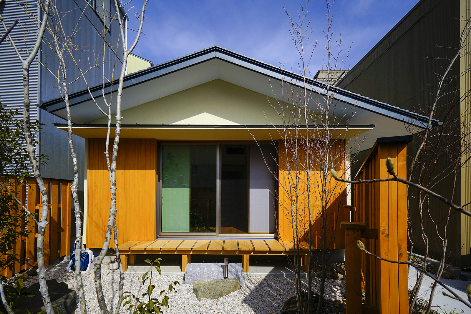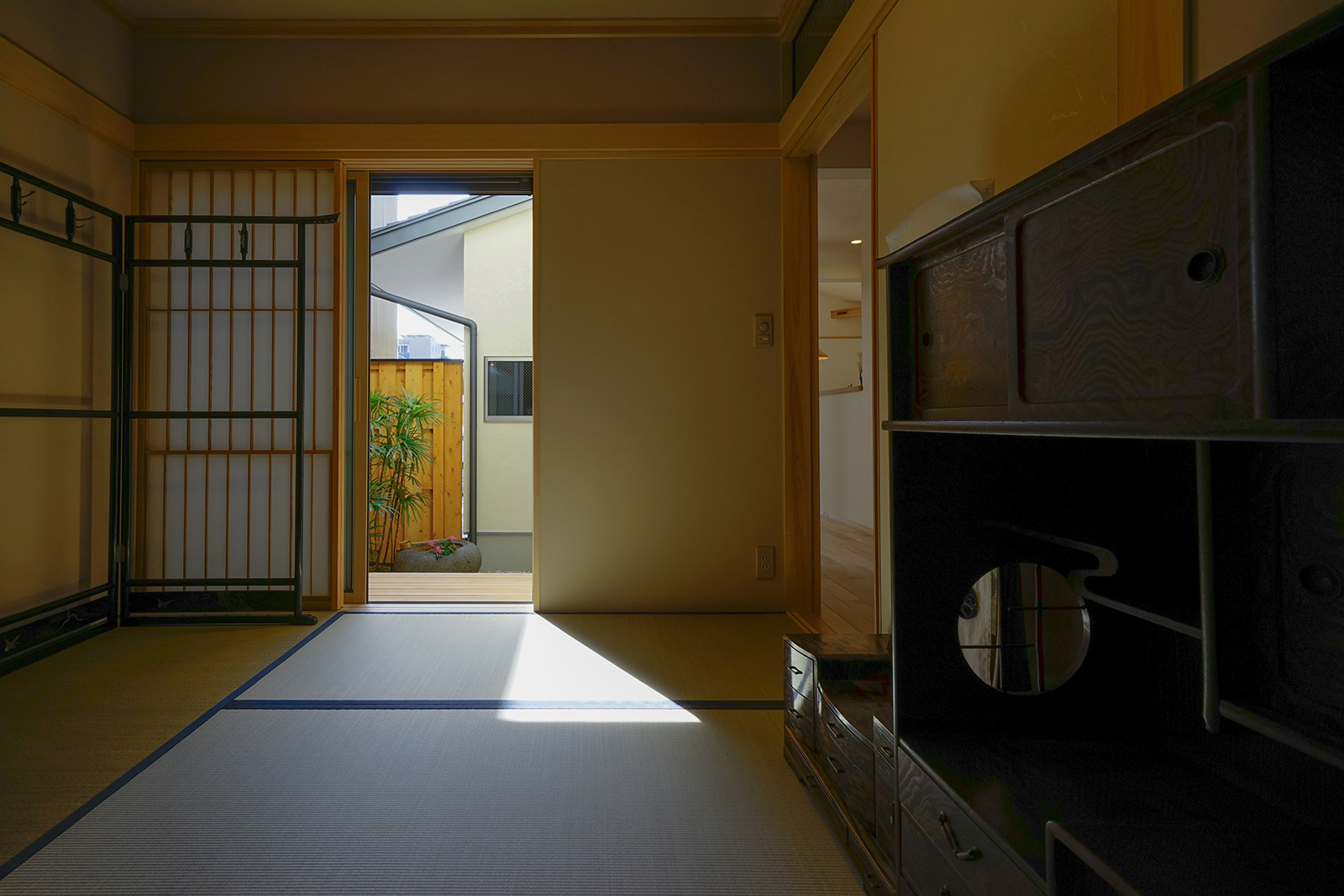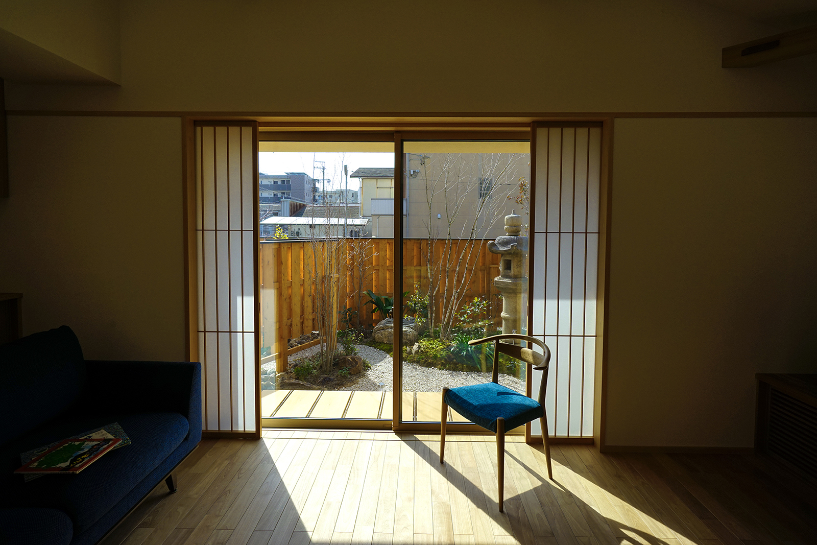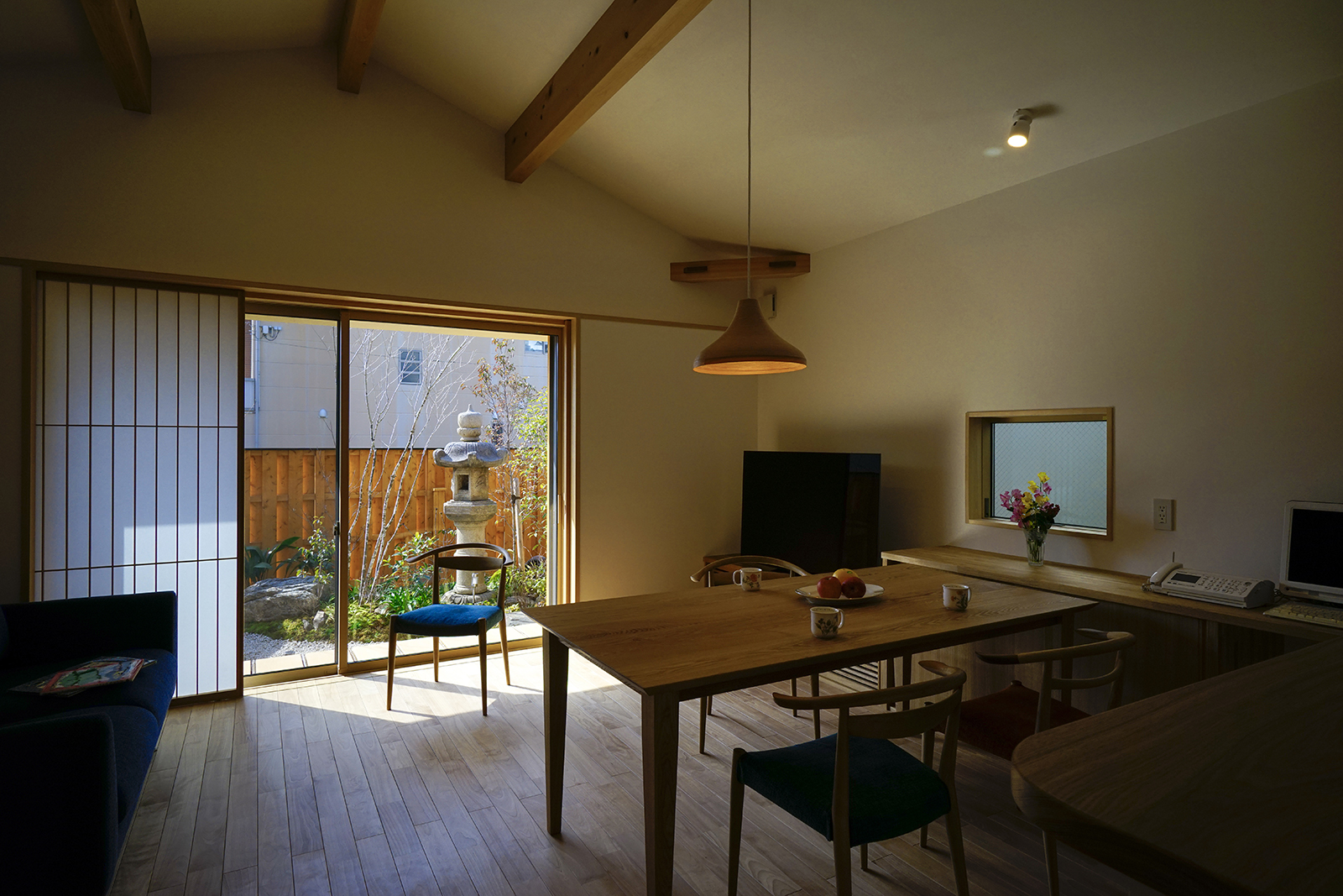 かつて御商売をされていたご実家を建て替え、家族が集まる場として住まいを設計しました。浜松駅近くの街中ということもあり、隣地がめいいっぱい建ち並んでいます。中庭を設けることで通風、採光を確保し、明るい庭、静かな暗さのある庭をテーマに設計しました。ご両親が大事にしていた灯篭や、つくばいなどを再度配置し、実家の面影をところどころに残しています。ともに住む家族の人数は変化しても、時々ふと思い出す、お子さん達にとっての実家の風景となればと思います。