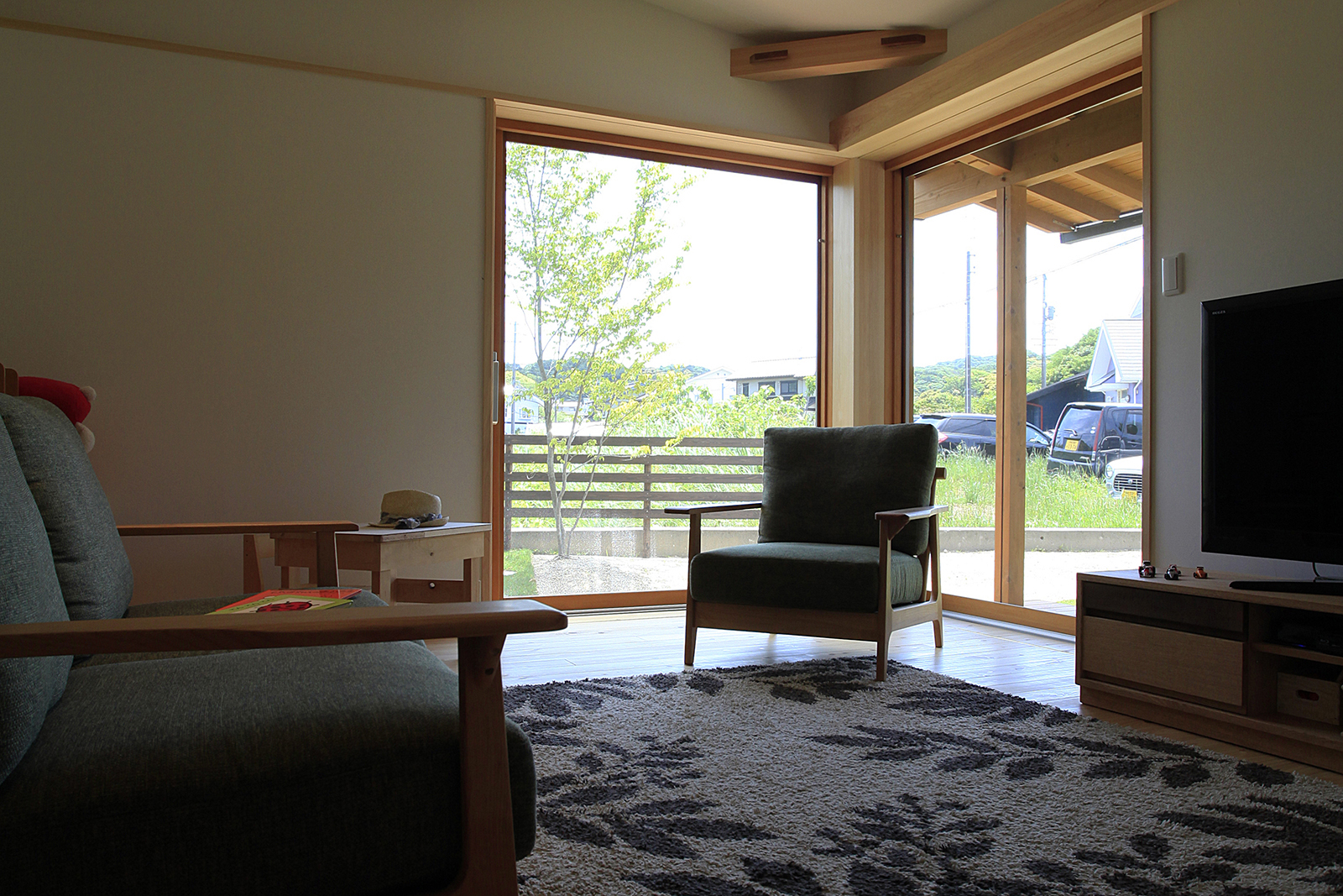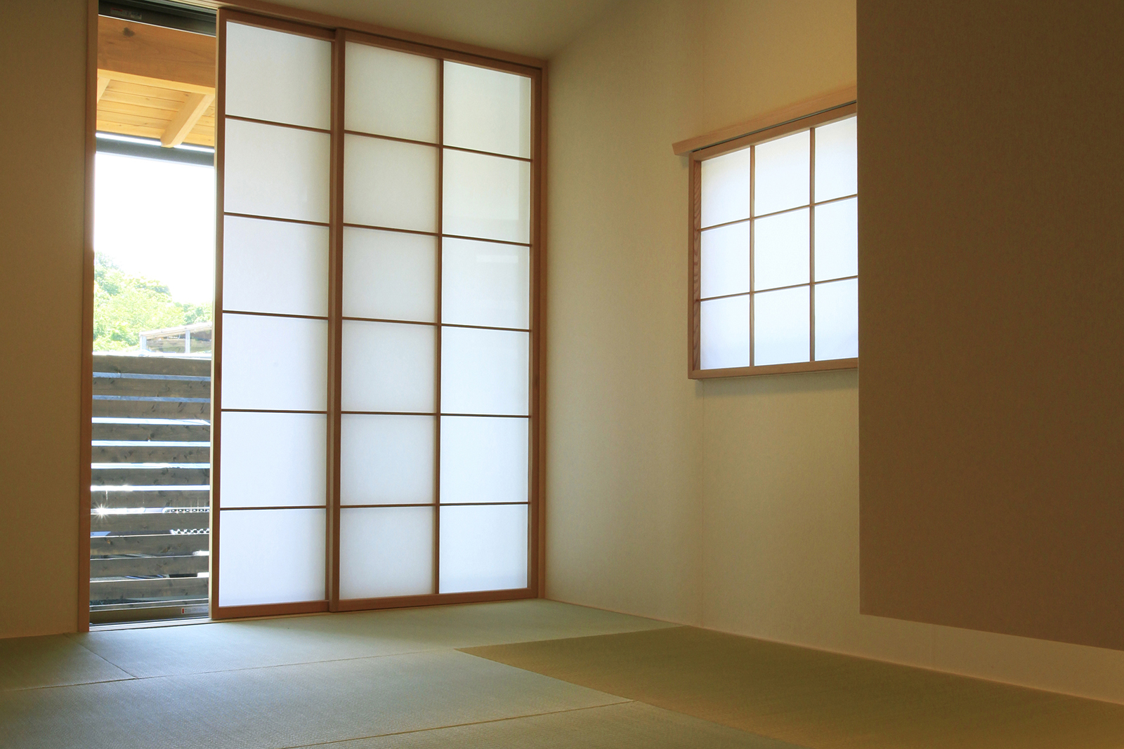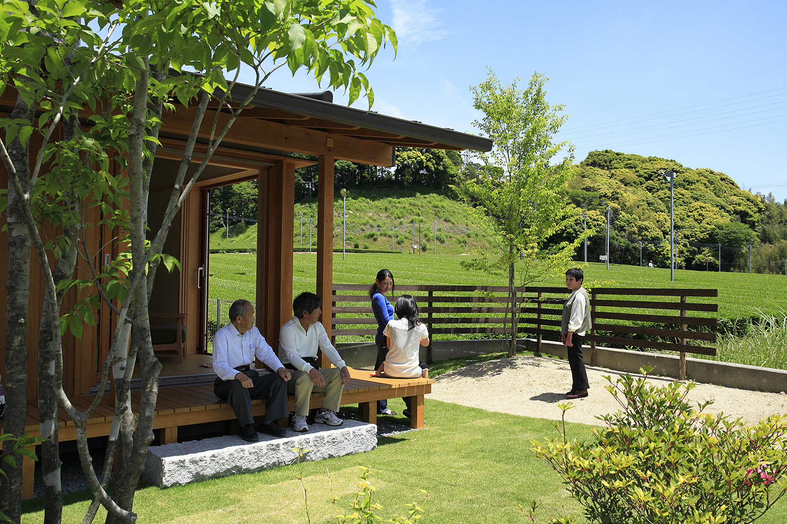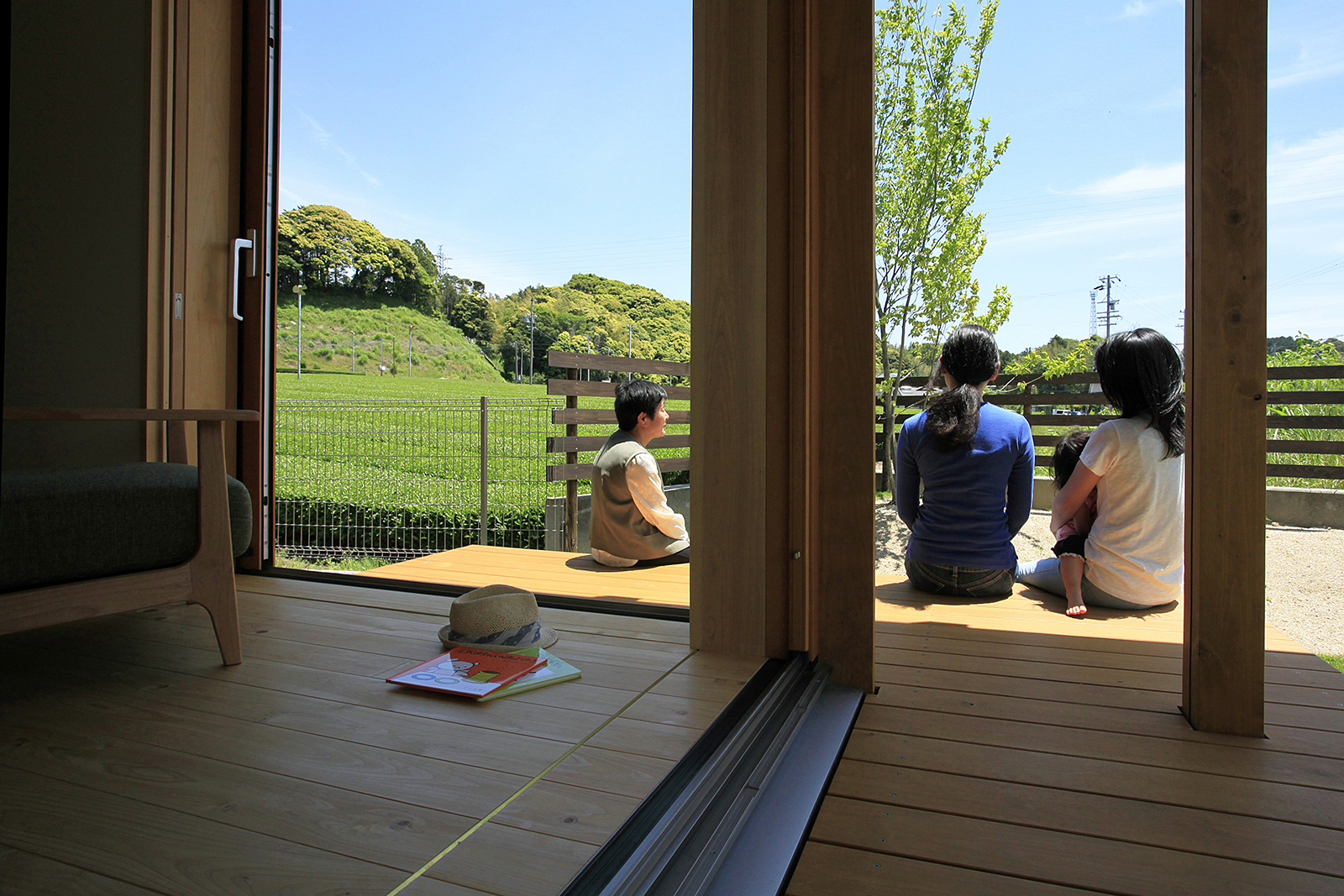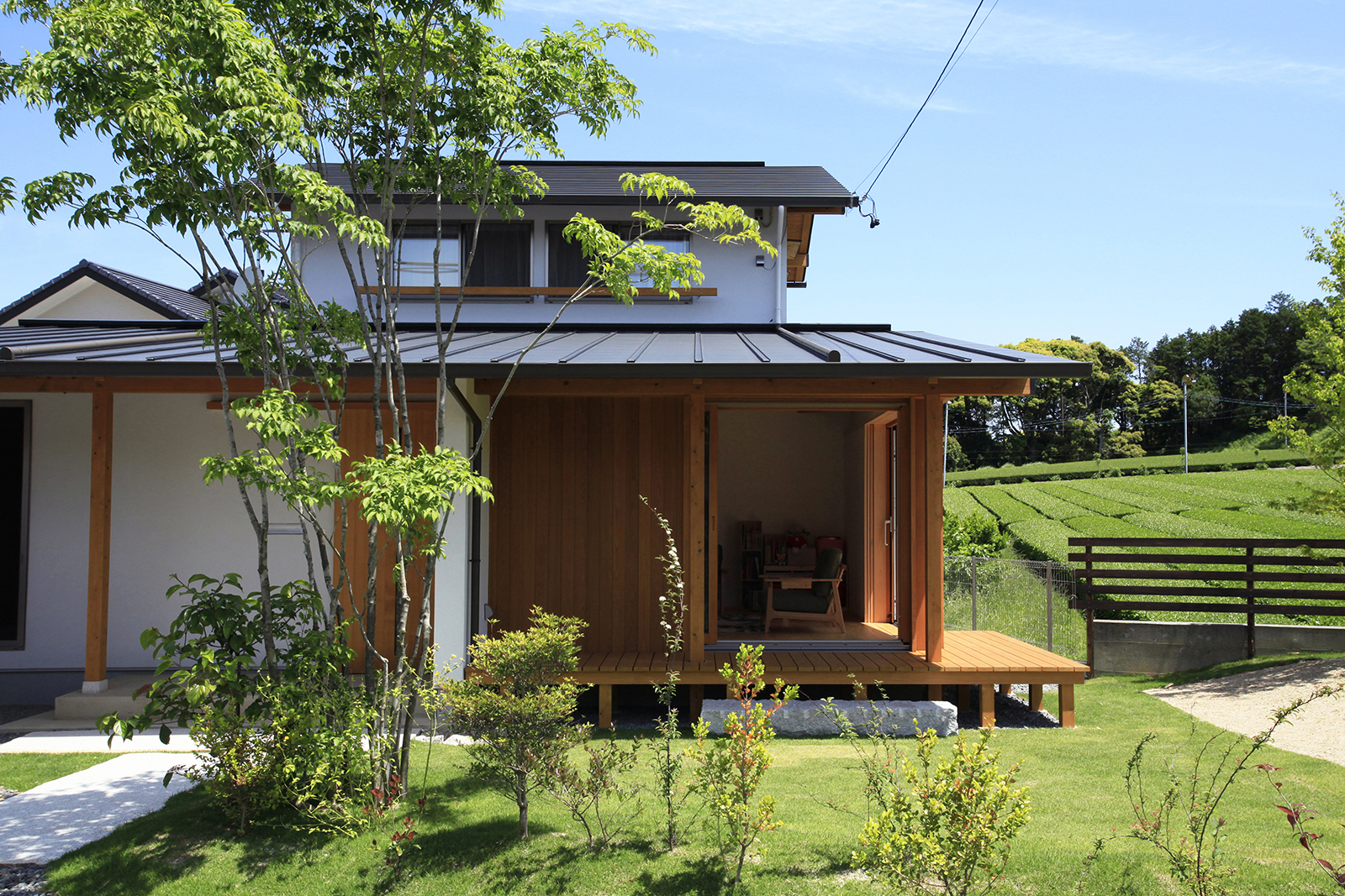 茶畑が広がる東側へは大胆に開き、リビング→デッキ→庭→茶畑と、視線の先には雄大な自然が広がります。コンパクトな設計ながら、それぞれの空間を区切りつつ、つながりつつ、広がりのある配置計画としています。夕暮れどきには南側の大きな窓の障子から光が漏れ、家路につく家族を優しく迎え入れることでしょう。