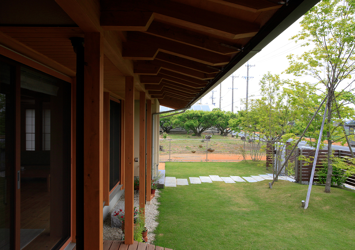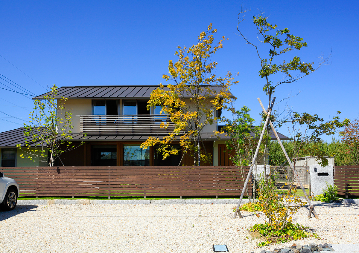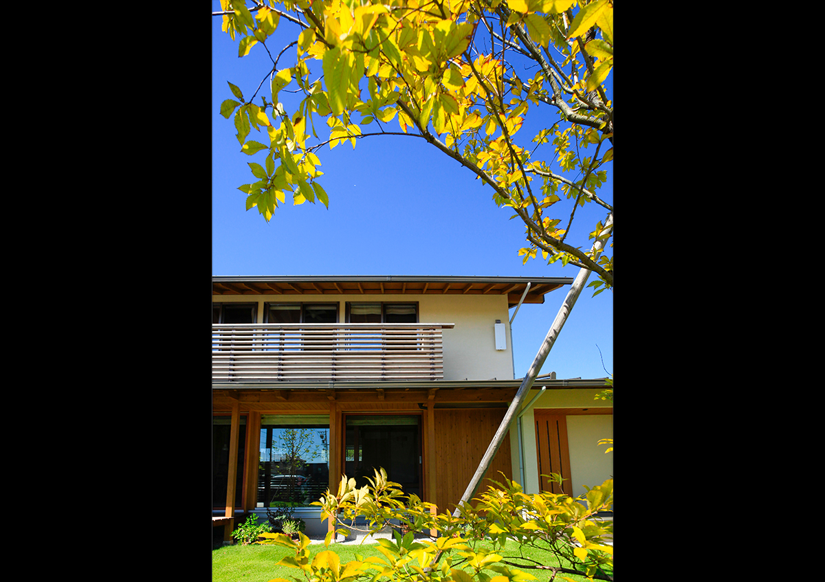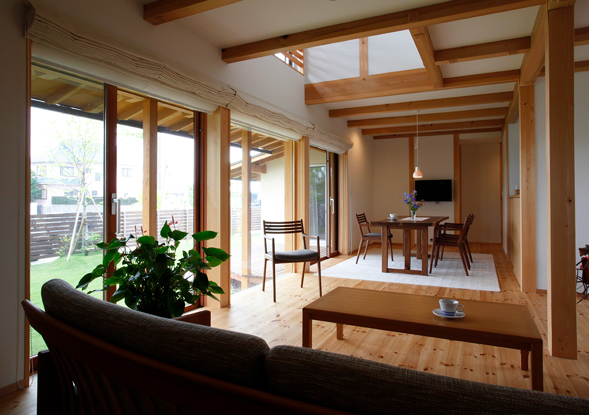 東と北に梅園があることから、梅の花にちなんだ中国の故事より命名された「好文木の家」。端正なフォルムを持つベーシックな切妻屋根をかけた外観が、周囲の木々のある風景にしっくりと馴染み、大地に根を張ったような安定感のある佇まいを見せています。内部空間は、部屋のいたるところから梅の木が見えるなど、外部とのつながりにより開放的でありながら、同時に落ち着きと居心地の良さも感じることができます。