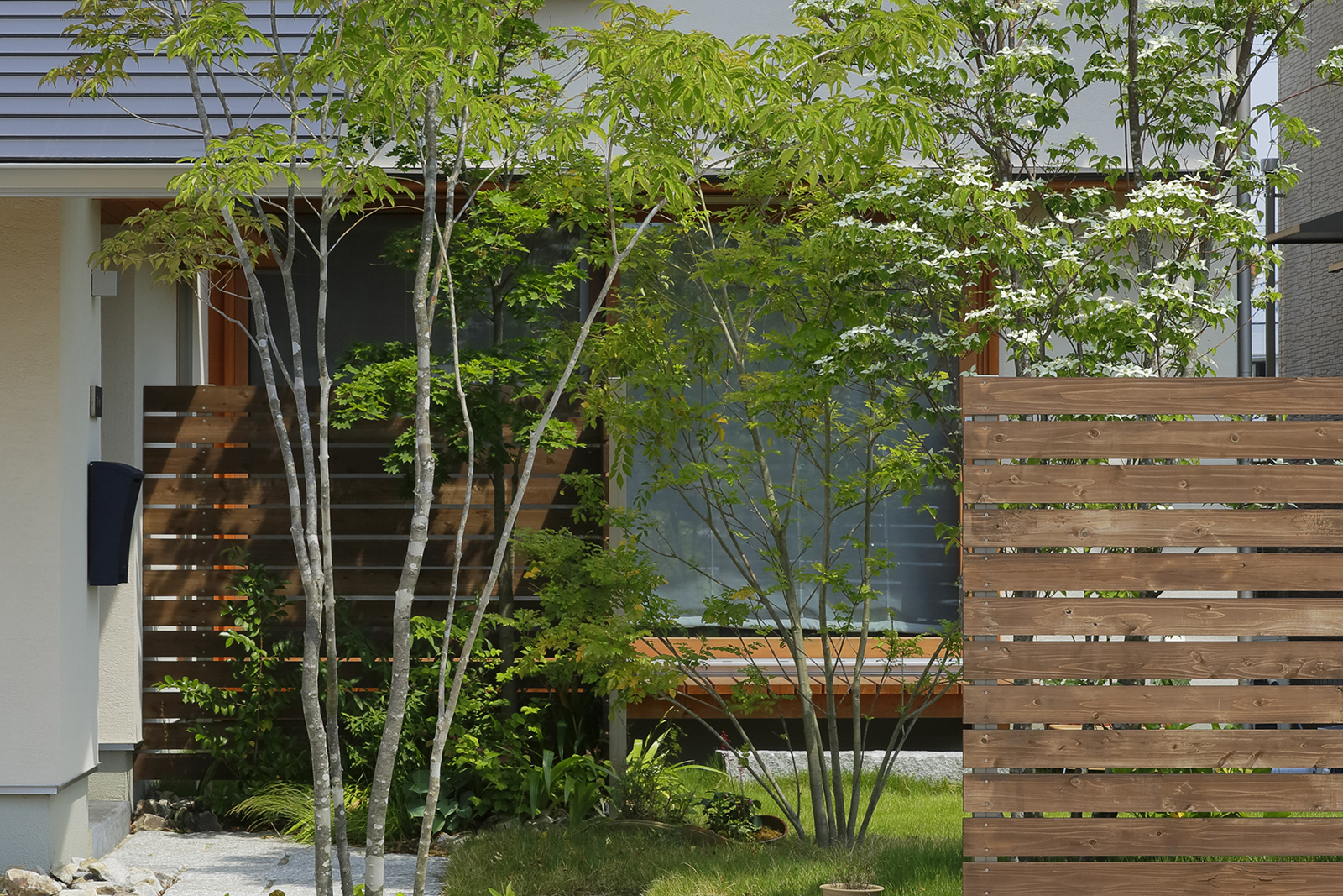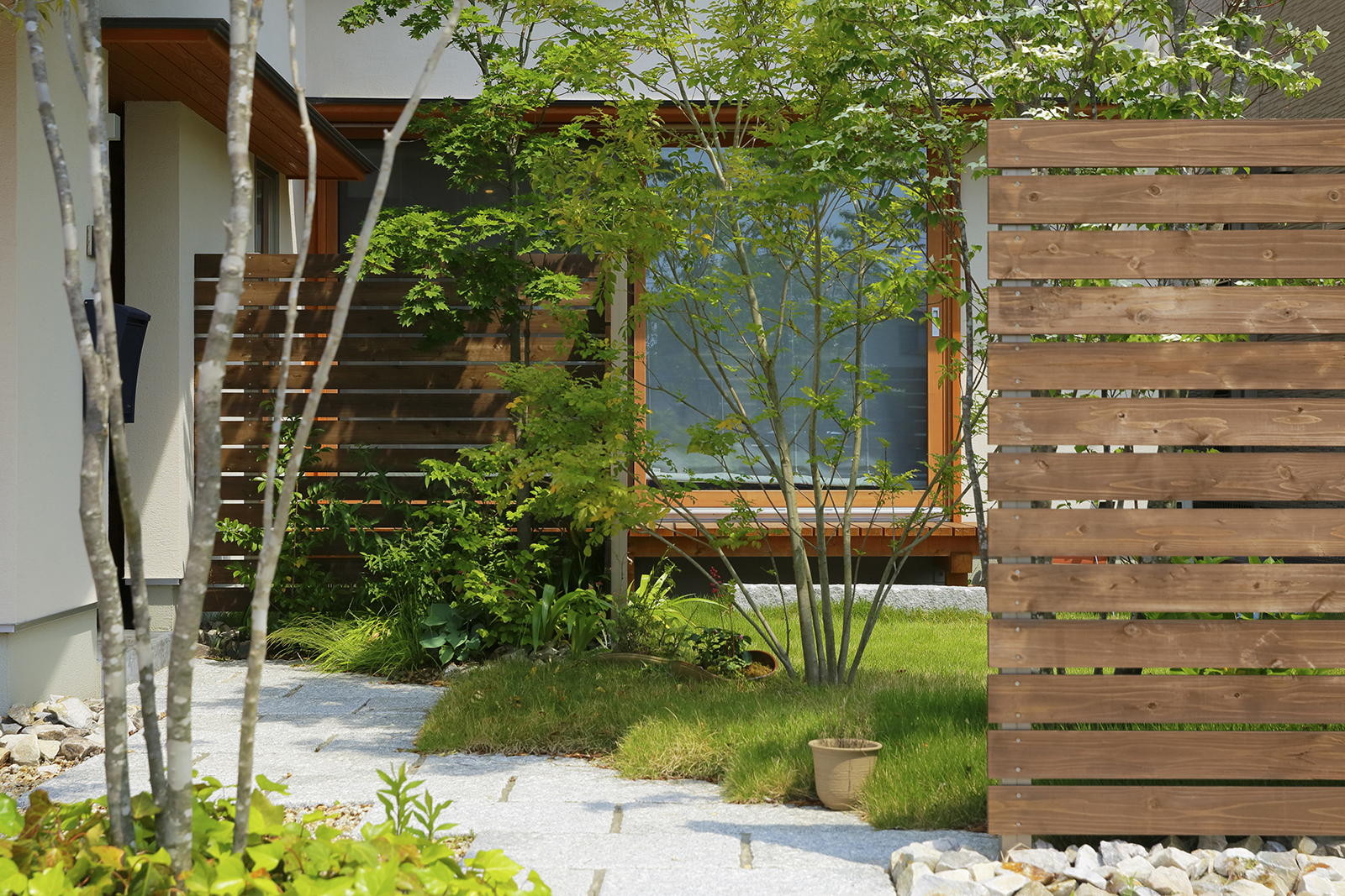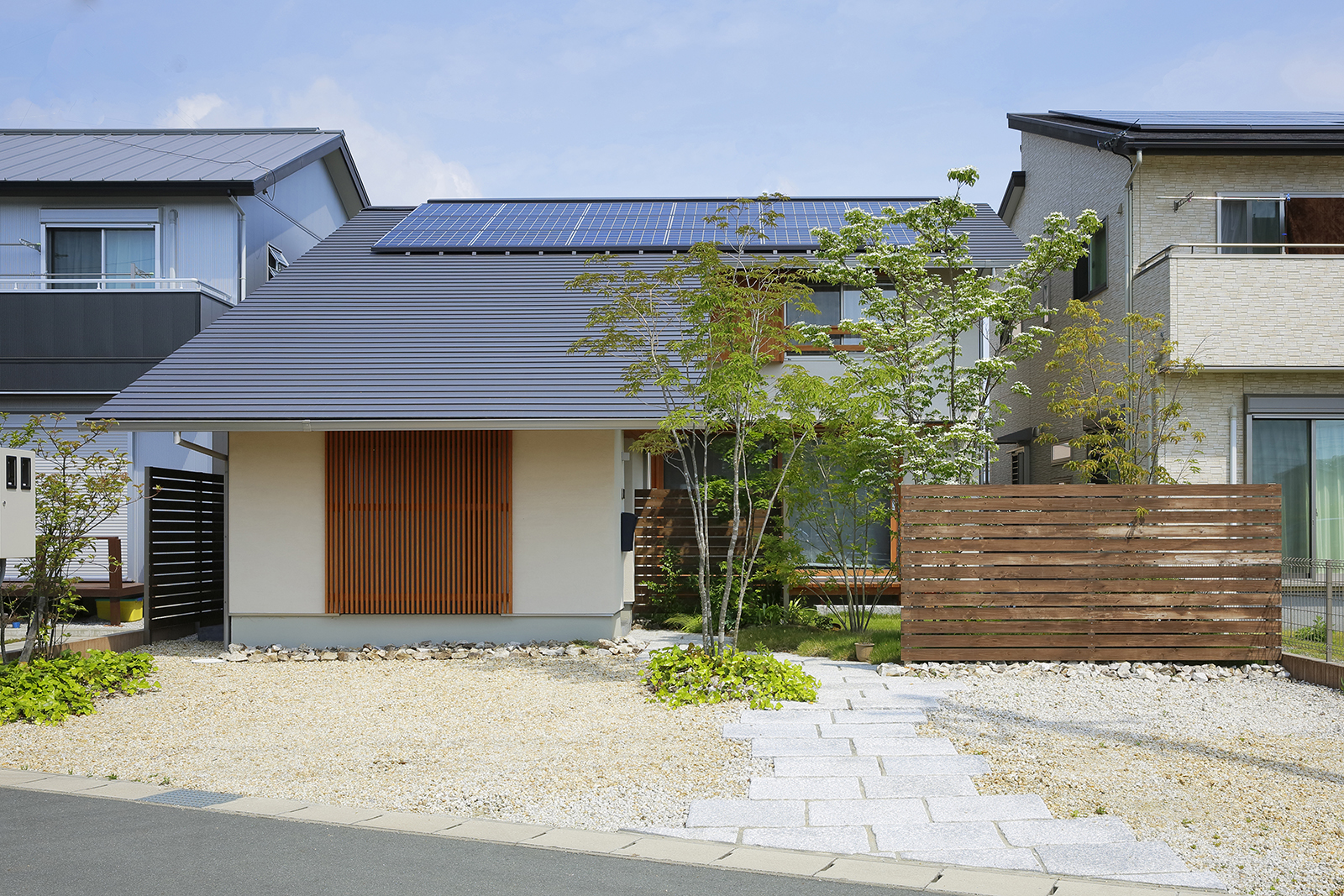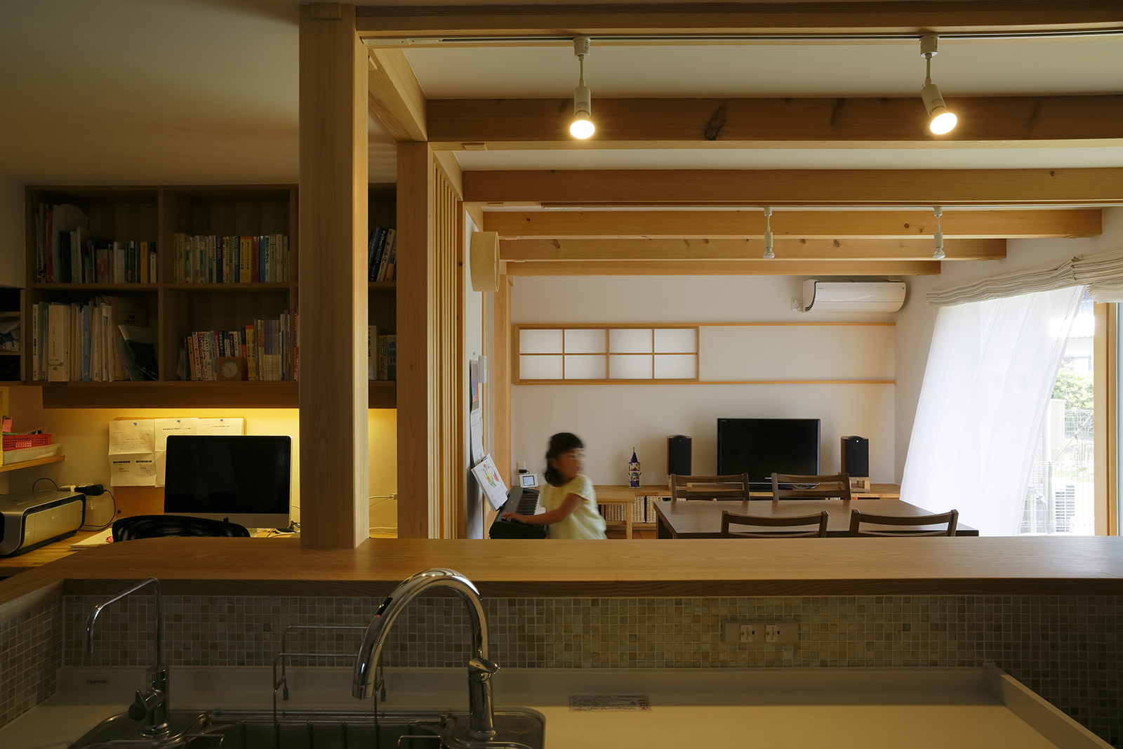 家の中に入ると、コンパクトな外観からは想像のできない伸びやかな空間が現れます。これは、空間を対角線上に見せることで広さを演出する設計の工夫の成せる業。また同時に、お客様の強いご要望である「風通しの良さ」も実現。これも窓の位置はもちろん、建具の位置まで計算し尽くした結果によるもの。まさに設計の妙が随所に生きています。音楽の大好きなご夫婦のリクエストにより設けられた防音室に因み命名された「暖音の家」。家に関する価値観を共有したお客様と建築士の暖かな和音が響いています。