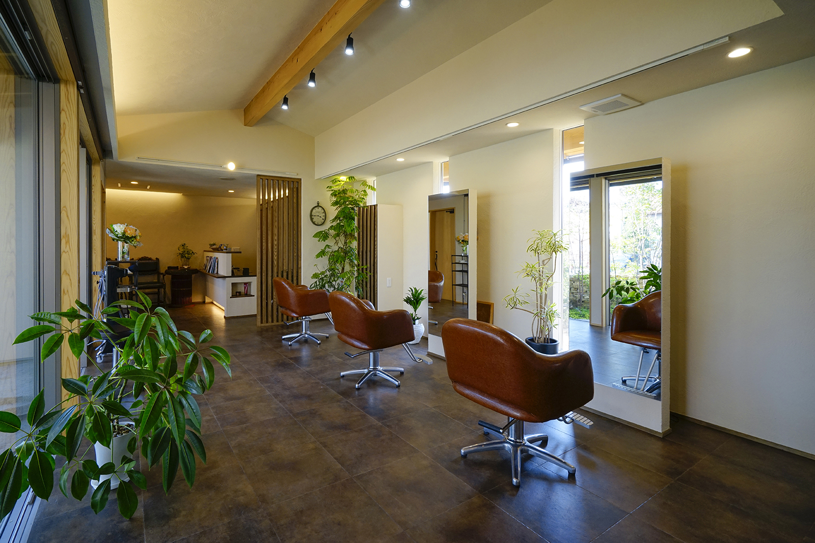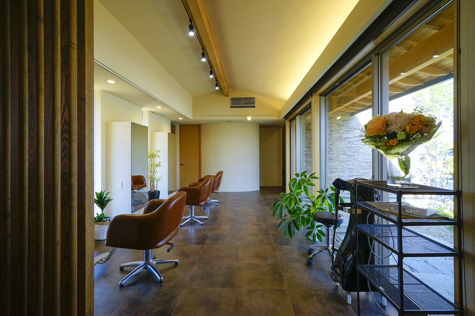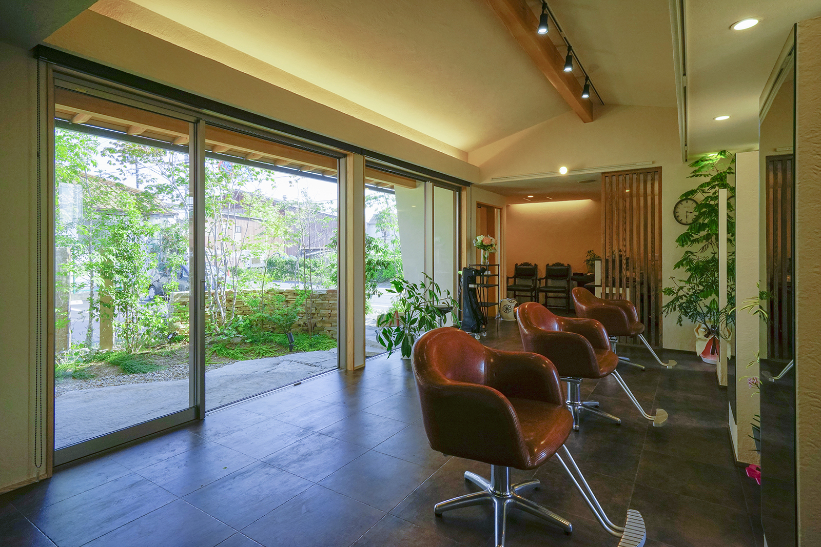交通量が多い道路沿いに建つ美容院です。建物の平面計画はH字型にして屈折部を多く造ることで、変化と広がりを持たせました。セッティングルームは、周囲からの視線を程よく遮りつつ景色を取り込むことで内部空間と外部空間とが連続して見え、特異な空間になりました。建物外観は道路側の建物を低く抑える事で行き交う人々への圧迫感を軽減しております。そして建物中央部は高くしこの部分をシャンプー室としました、高窓から自然光が降り注ぐ、非日常的な優しい空間となっております。主庭にはバランス良く新しい樹木を植えることで街に潤いを与えております。元々北隣には緑が生い茂っておりその樹木と主庭に挟まれるような配置で建物を計画、お店を来られる皆様が四季折々移りゆく景色を楽しめる空間にしたいと考えました。