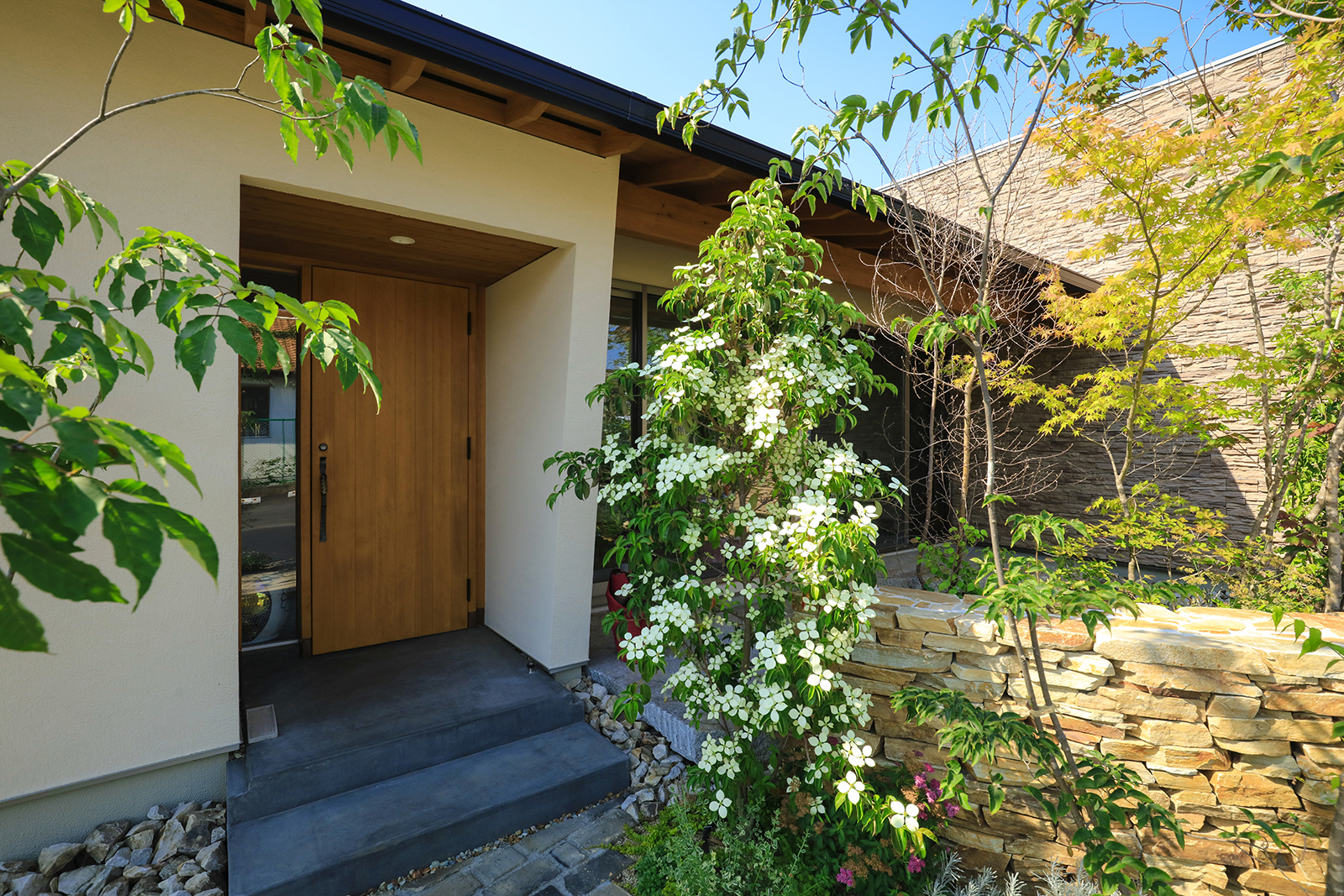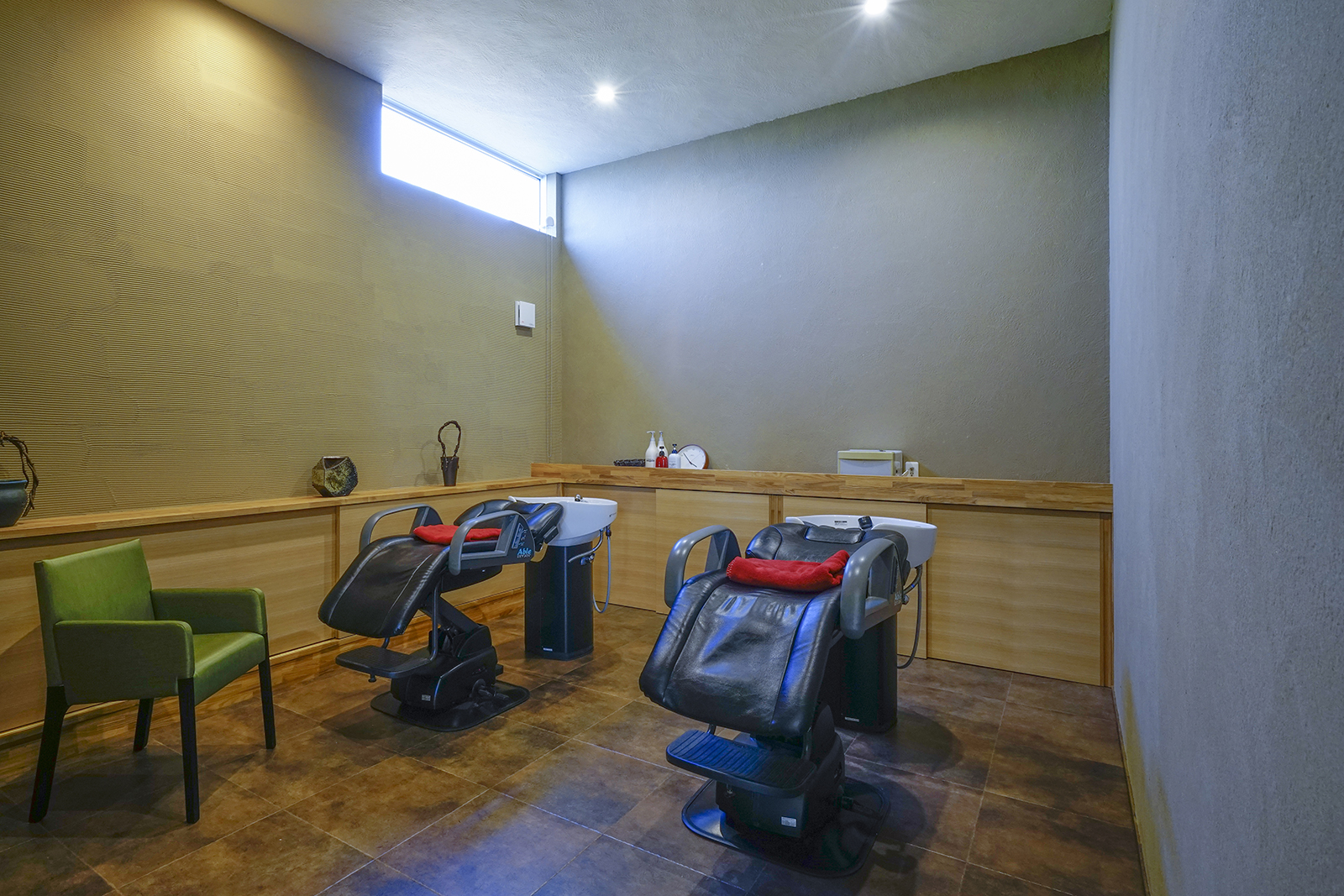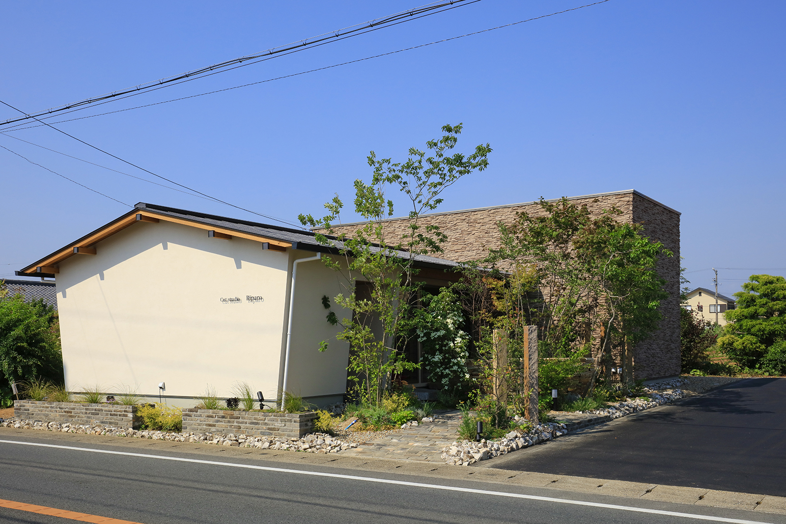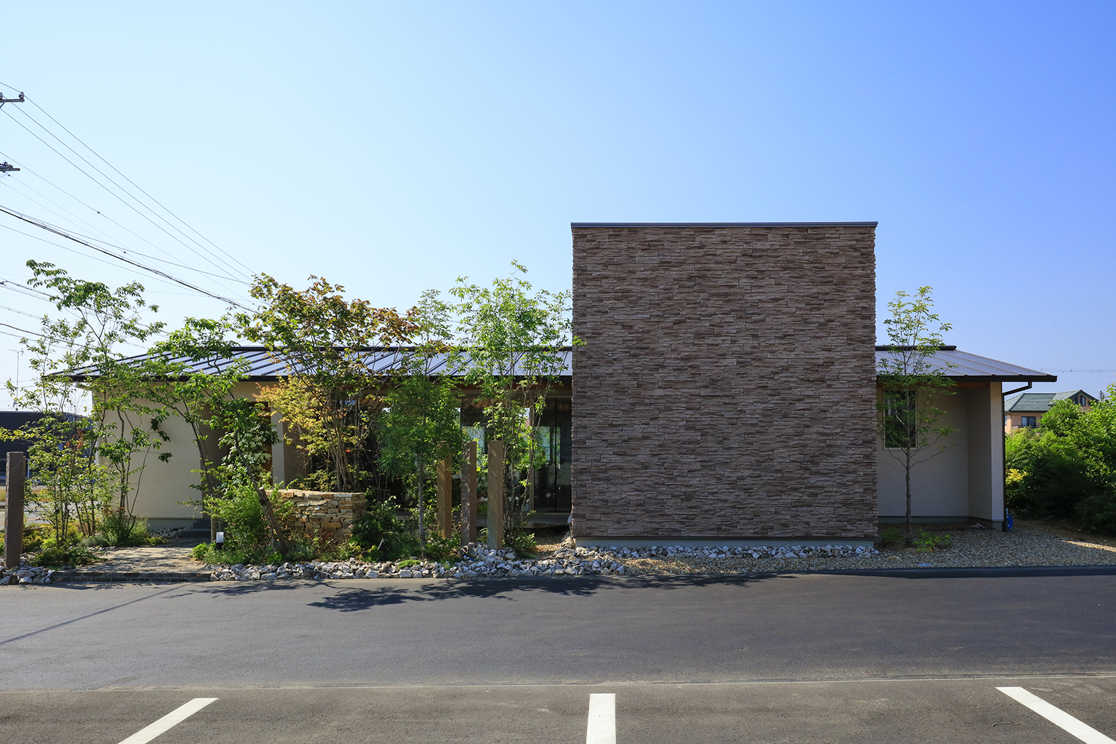 交通量が多い道路沿いに建つ美容院です。建物の平面計画はH字型にして屈折部を多く造ることで、変化と広がりを持たせました。セッティングルームは、周囲からの視線を程よく遮りつつ景色を取り込むことで内部空間と外部空間とが連続して見え、特異な空間になりました。建物外観は道路側の建物を低く抑える事で行き交う人々への圧迫感を軽減しております。そして建物中央部は高くしこの部分をシャンプー室としました、高窓から自然光が降り注ぐ、非日常的な優しい空間となっております。主庭にはバランス良く新しい樹木を植えることで街に潤いを与えております。元々北隣には緑が生い茂っておりその樹木と主庭に挟まれるような配置で建物を計画、お店を来られる皆様が四季折々移りゆく景色を楽しめる空間にしたいと考えました。
