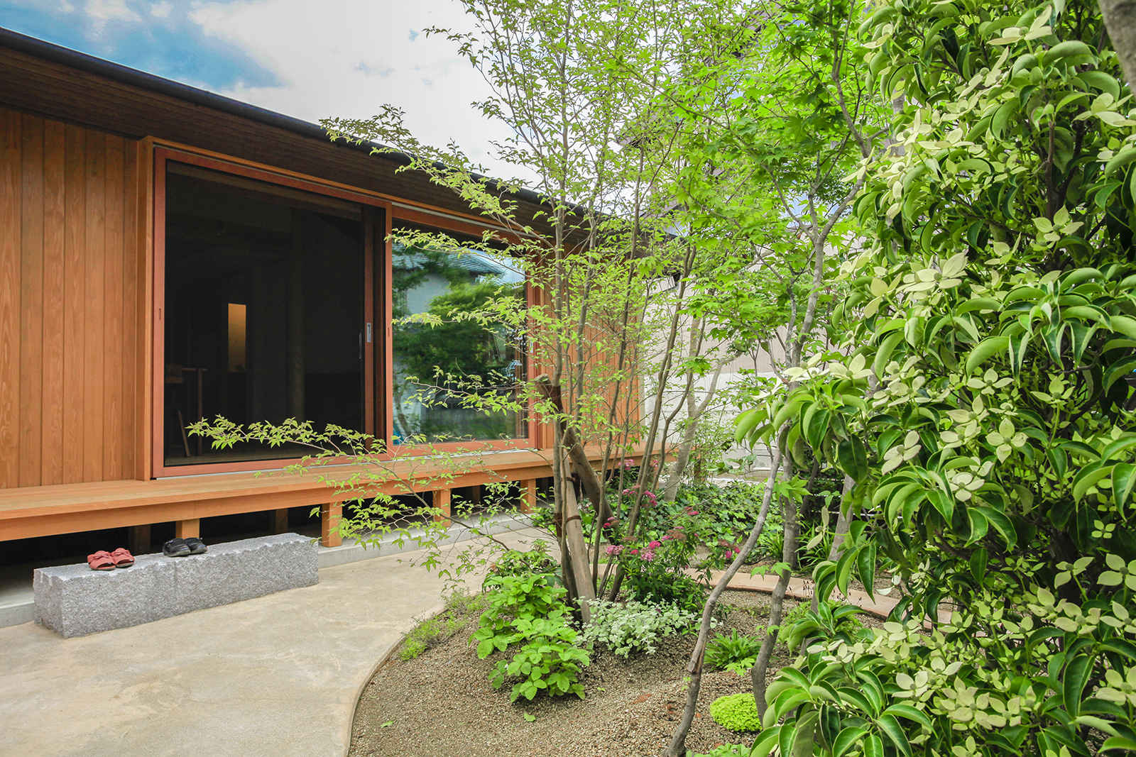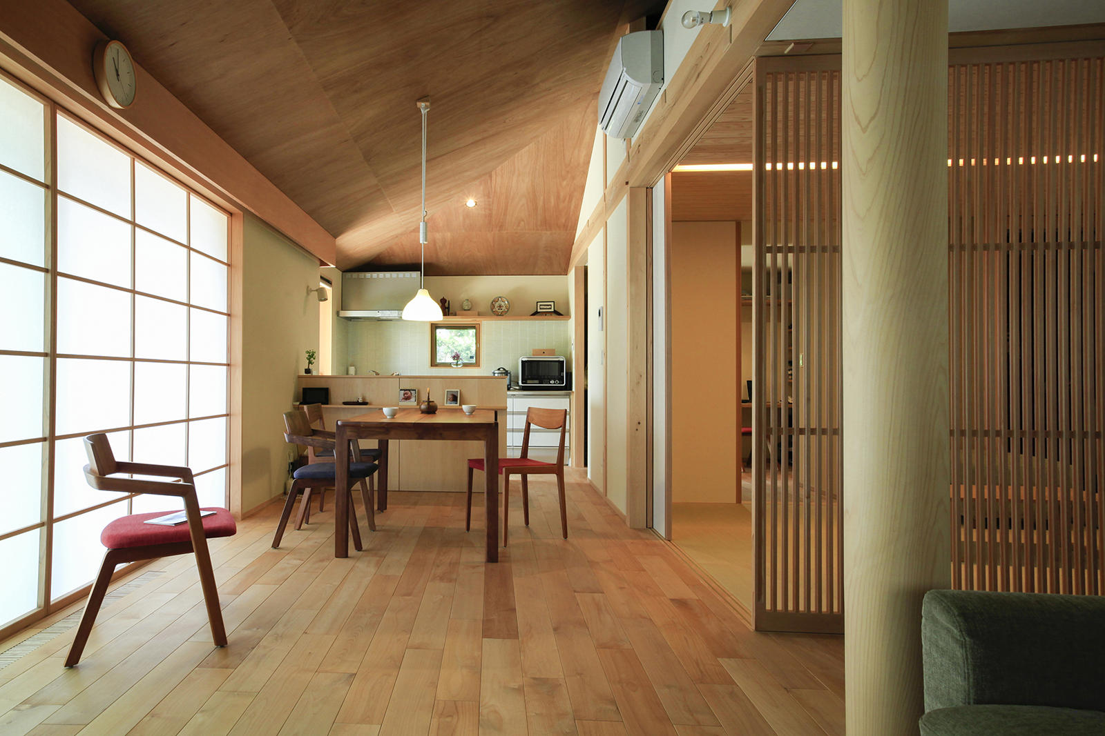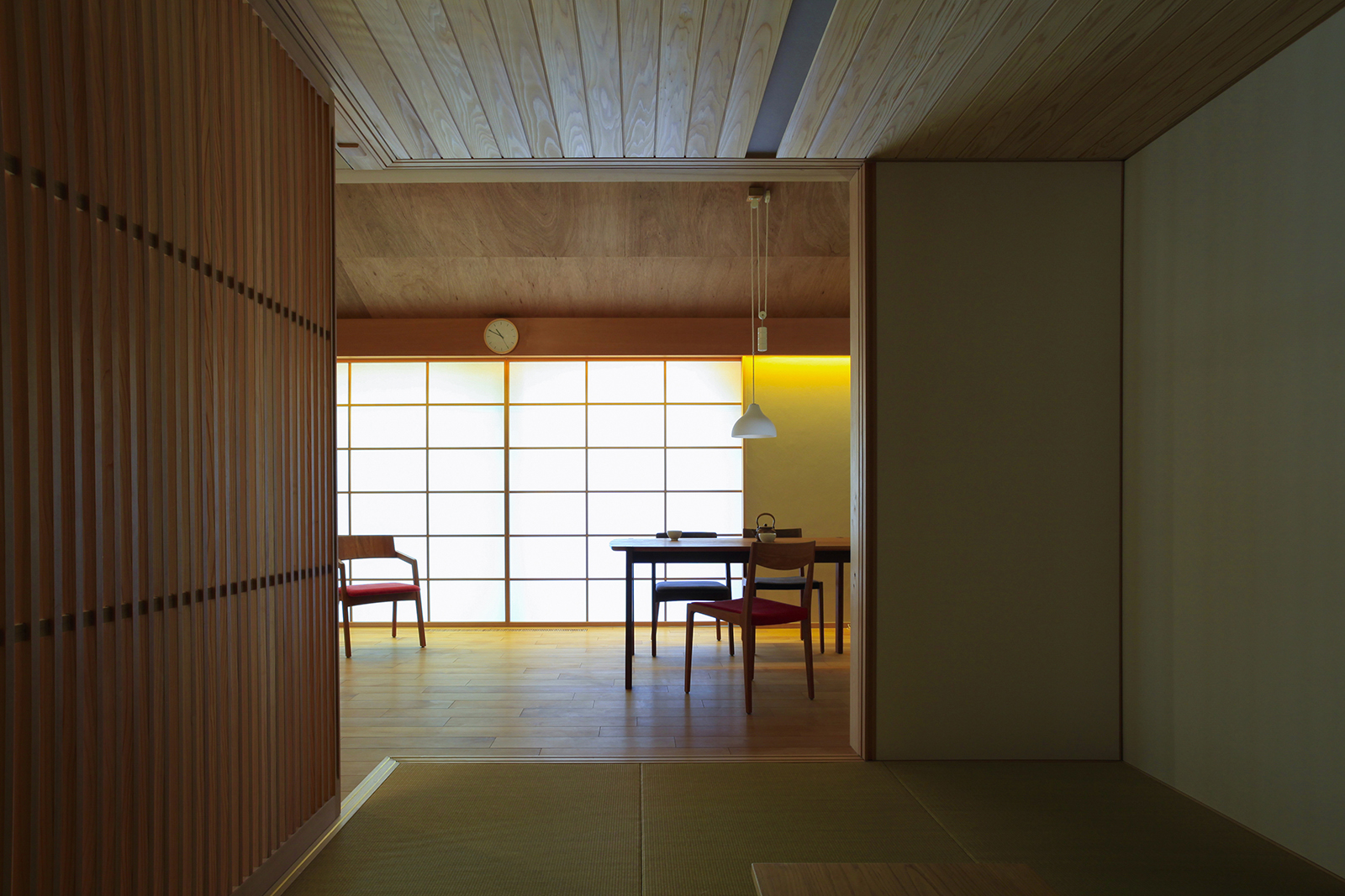 夫婦ふたりで住む平屋です。今までお住まいになっていた広い2階建から必要なものを見直し、二人の生活に必要十分な空間をつくりました。行き止まりの無い回遊性のある動線は、コンパクトなボリュームを感じさせない広がりを生み出しています。「夏涼しく、冬暖かい家」を主題とし、夏は十分な自然採風と軒で日射しを遮り、冬は床下エアコンで家全体を暖めます。