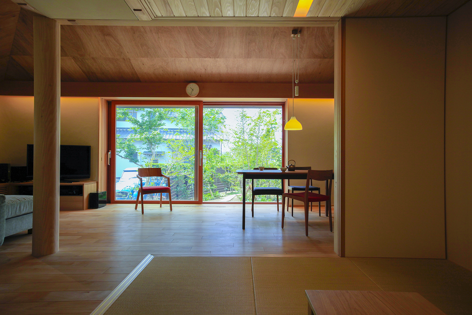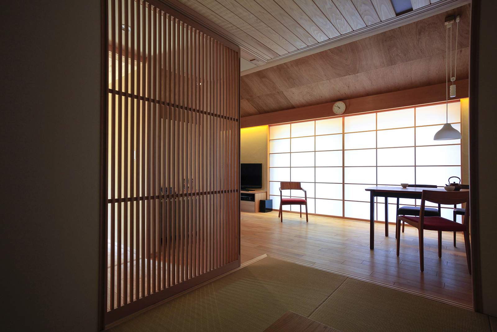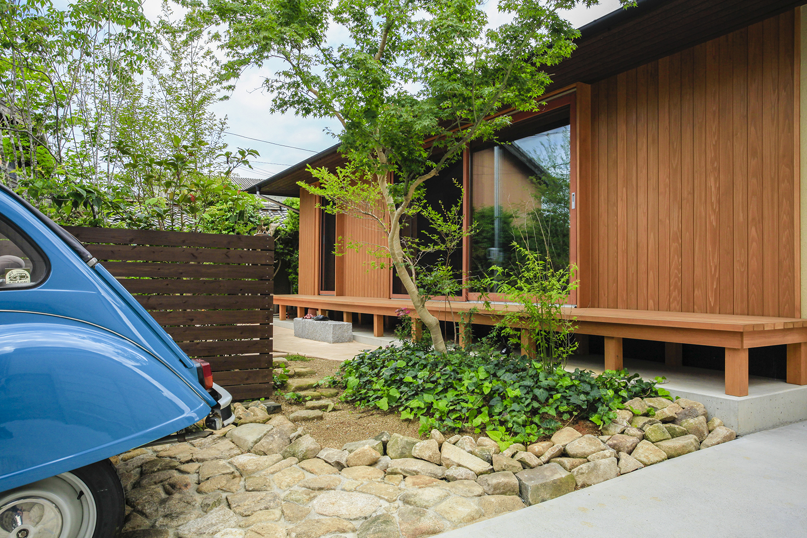 夫婦ふたりで住む平屋です。今までお住まいになっていた広い2階建から必要なものを見直し、二人の生活に必要十分な空間をつくりました。行き止まりの無い回遊性のある動線は、コンパクトなボリュームを感じさせない広がりを生み出しています。「夏涼しく、冬暖かい家」を主題とし、夏は十分な自然採風と軒で日射しを遮り、冬は床下エアコンで家全体を暖めます。