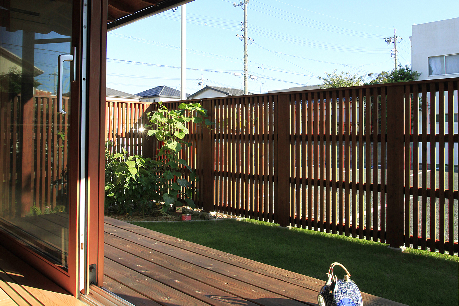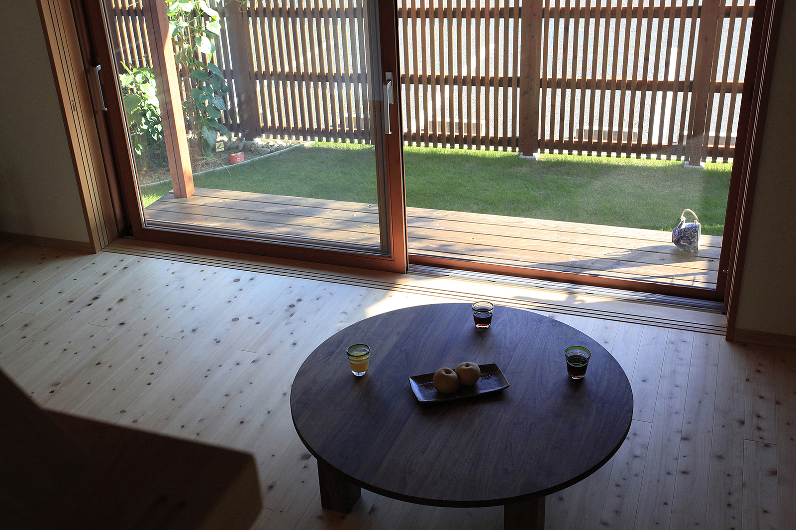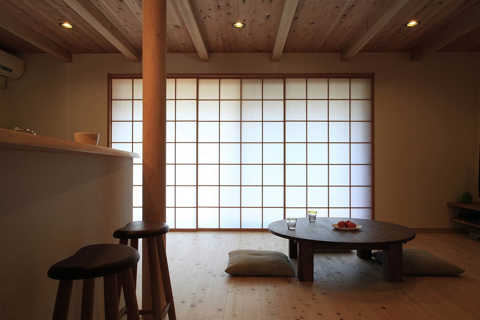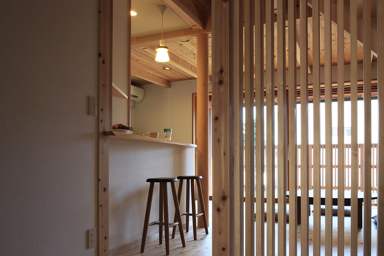 童部(わらしべ)とは、今回、子供たちと言う意味で名付けさせていただきました。壁に格子、2階廊下をスノコにし、1,2階のつながりや、開放感をだしました。玄関を開けると格子越しに南の庭まで抜けます。窓は木製の2間開口にしました。子供の頃のおもいで記憶を思い出す事は、必要不可欠で、とてもいいモノです。子供の頃の楽しかったおばあちゃんの家の記憶のように、今度は、お子様たちが、ご家族とのこの家での暮らしで、たくさんの素敵な思い出ができることを願います。大切なシーンを飾れますように。