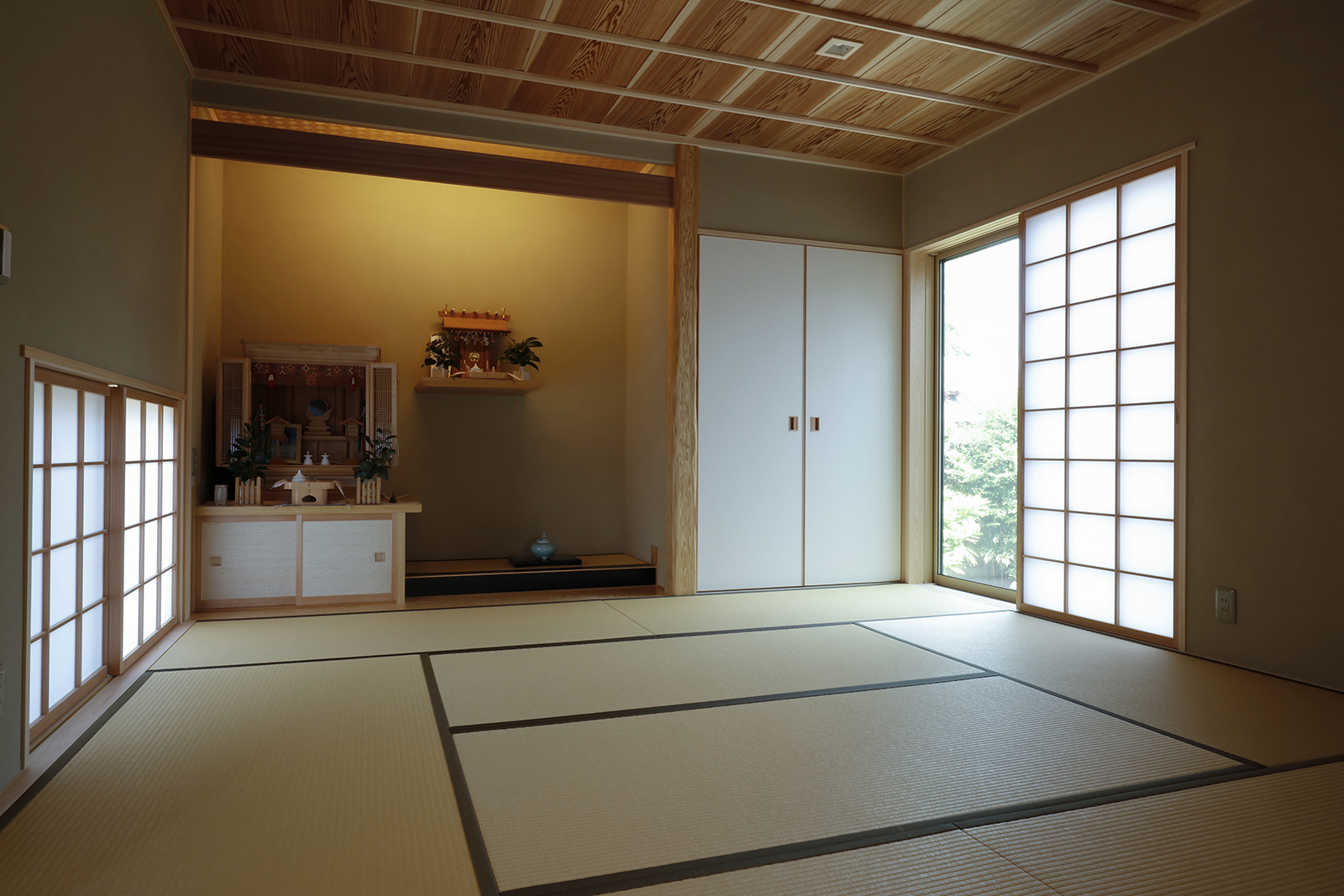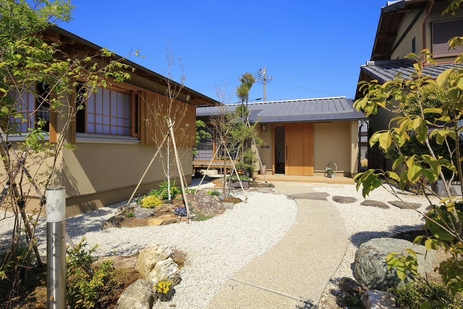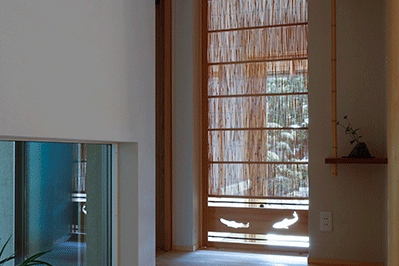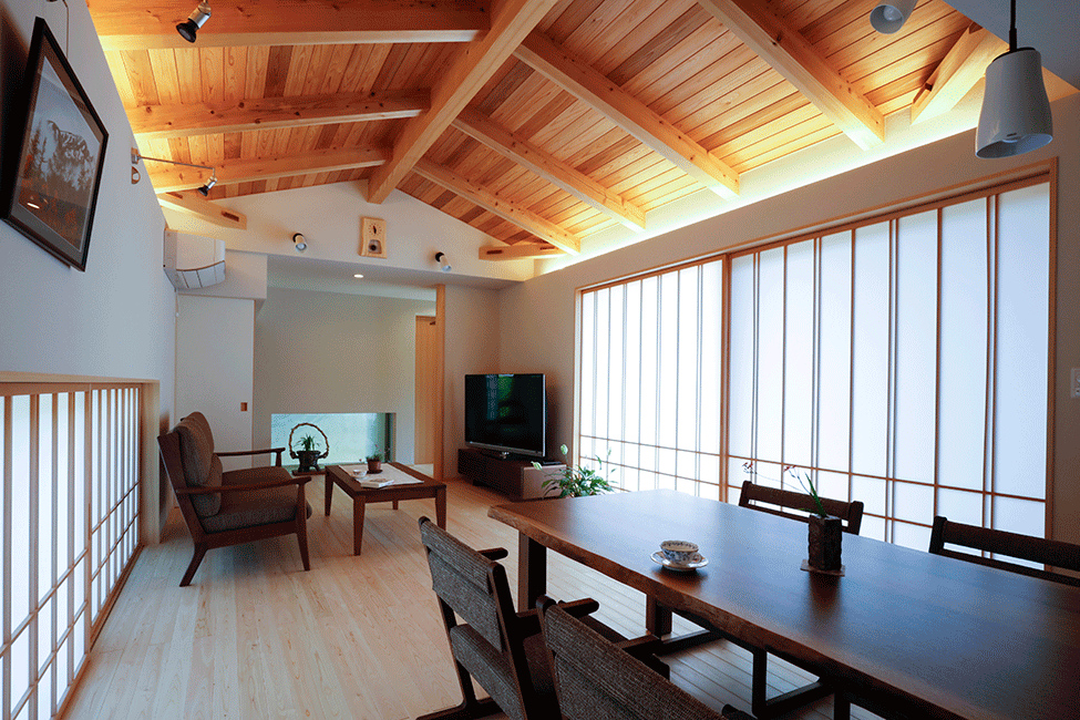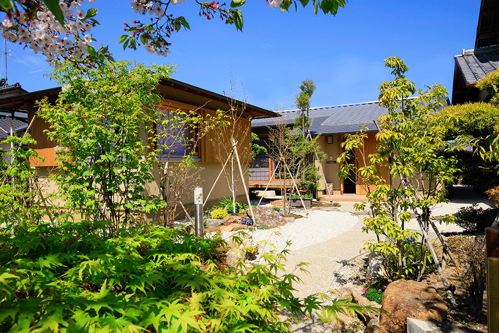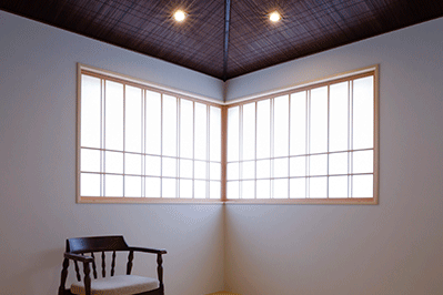 築100年を超える入口の門が、存在感を醸し出しています。門を潜ると手入れの行き届いた日本庭園が広がります。リビングからは、東・南・北と違ったタイプの庭が愉しめ、ダイニング・キッチンからは、家の象徴でもある大きな門まで視線が通ります。寝室は、木製サッシを角に寄せた事で、四季を感じる美しい和の庭園をパノラマに取り込む事ができました。円居とは、親しく集まりあうという意味。お孫さんや、ご近所さん、親しい仲間が遊びに来たくなる、そんな居心地の良い場所ができました。