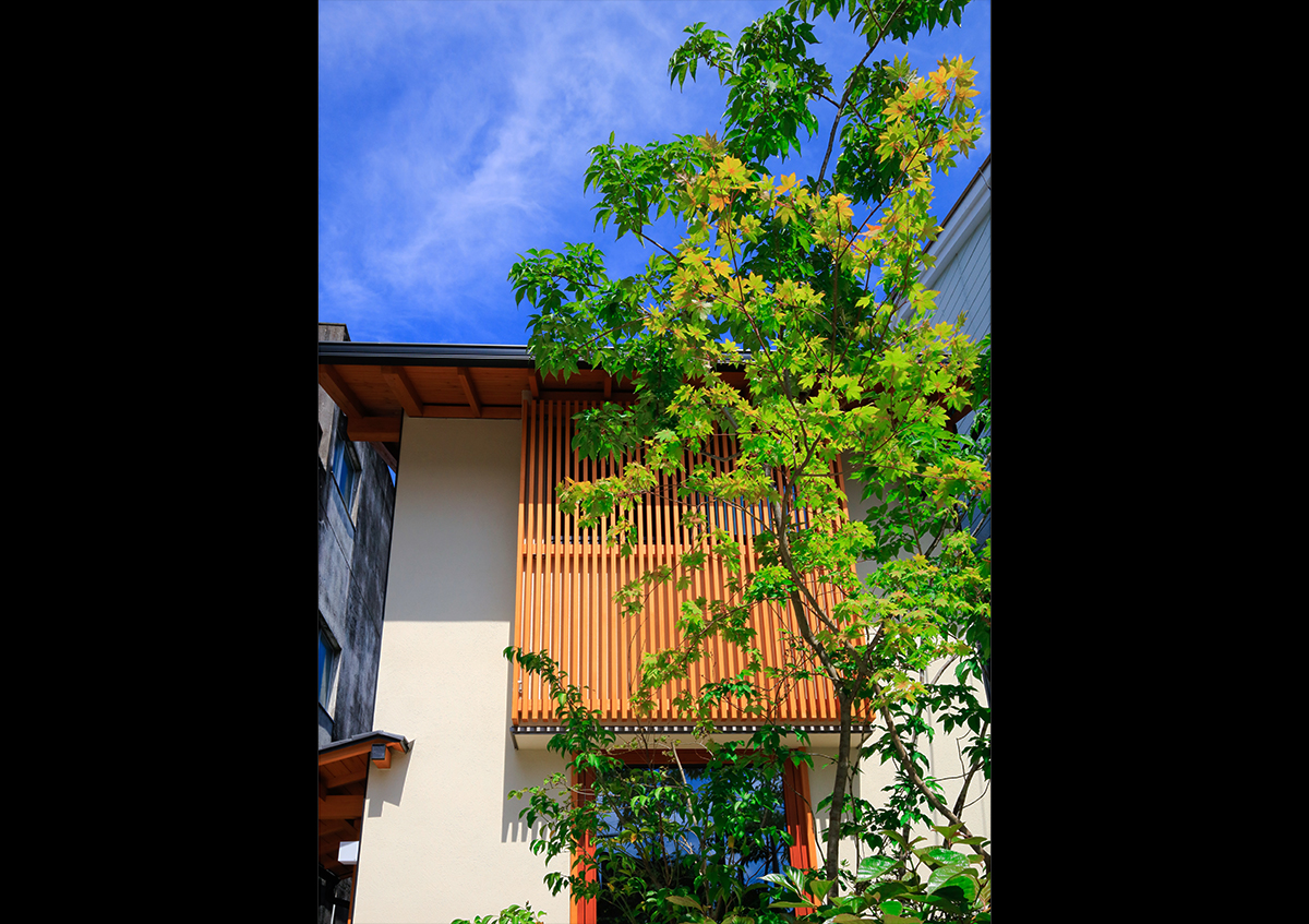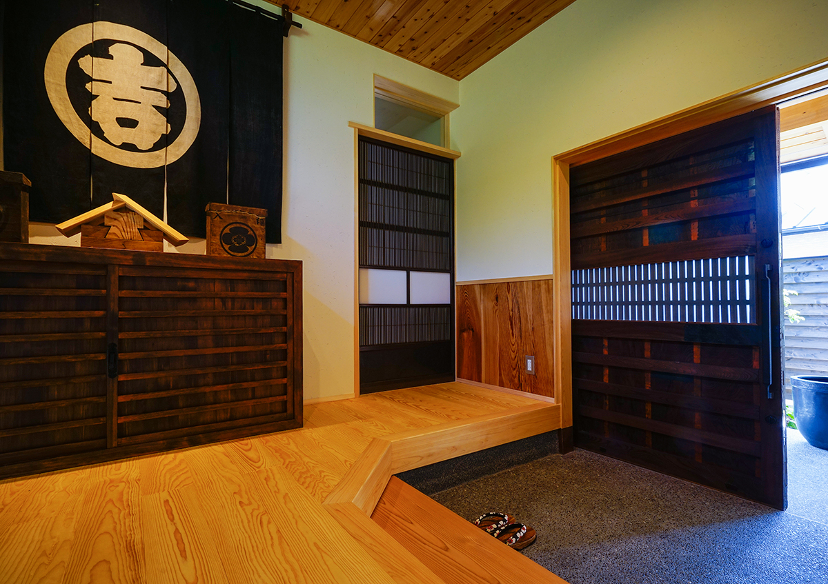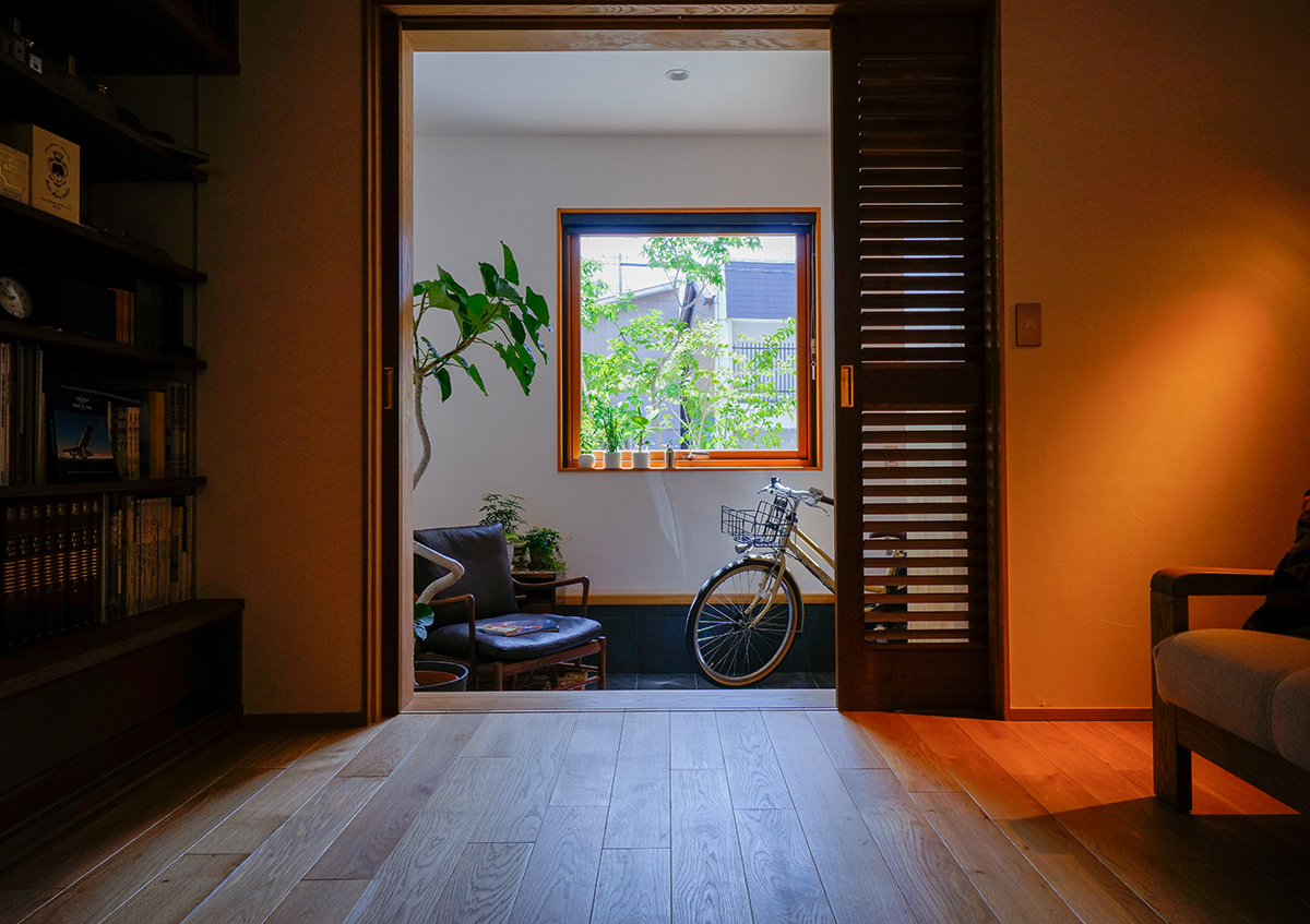 間口約6m、奥行き約50mとい細長い敷地に建てた完全分離型の二世帯住宅です。ここは、代々受け継がれてきた来歴ある土地で、築百数十年の蔵をはじめ、住居、事務所、工場が1列に立ち並んでいました。親世帯が暮らす「幸漆の家」では、愛着ある蔵の記憶と趣を留めるべく、牛梁や天秤梁として使われていた材や、蔵戸、床板、箱階段などを熟達した大工や家具職、製材業者などの匠の技で再生し、往時の面影を残しています。一方、子世帯の「幸然の家」は、シックでナチュラルな北欧テイストの内装デザインを取り入れ、洗練された大人の雰囲気を漂わせています。また建物形状は、親世帯棟と子世帯棟が東西につながった連棟タイプですが、プライバシーの確保を重視し、あえて共用スペースは設けず、電気、ガス、などのインフラ設備に関しても世帯別としています。いわば、それぞれの世帯のライフスタイルを尊重した、感覚としては燐居や近居に近い、大人どうしの二世帯住宅といえるでしょう。(ウッドデザイン賞2020 受賞)