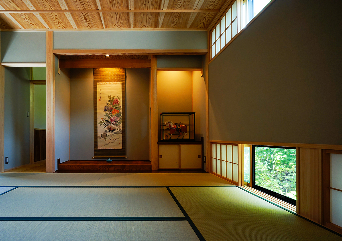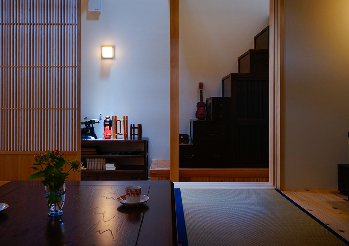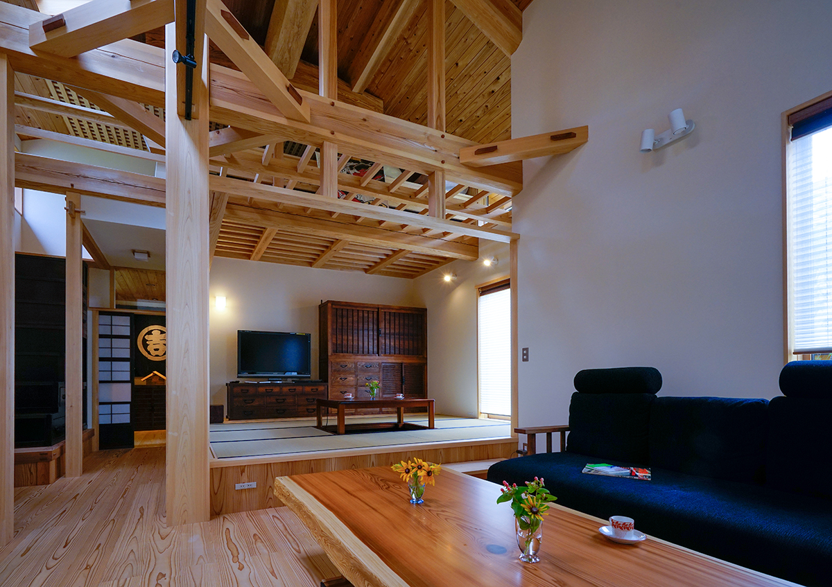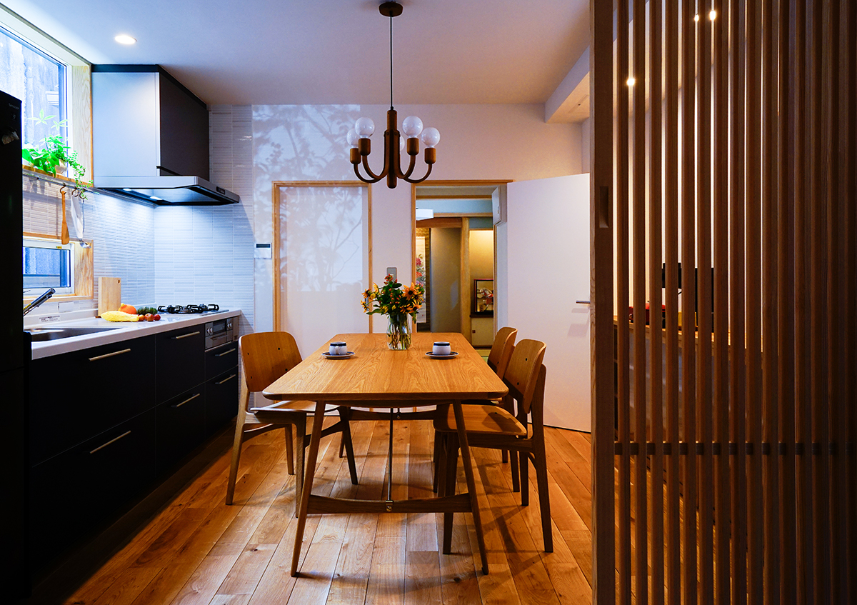 間口約6m、奥行き約50mとい細長い敷地に建てた完全分離型の二世帯住宅です。ここは、代々受け継がれてきた来歴ある土地で、築百数十年の蔵をはじめ、住居、事務所、工場が1列に立ち並んでいました。親世帯が暮らす「幸漆の家」では、愛着ある蔵の記憶と趣を留めるべく、牛梁や天秤梁として使われていた材や、蔵戸、床板、箱階段などを熟達した大工や家具職、製材業者などの匠の技で再生し、往時の面影を残しています。一方、子世帯の「幸然の家」は、シックでナチュラルな北欧テイストの内装デザインを取り入れ、洗練された大人の雰囲気を漂わせています。また建物形状は、親世帯棟と子世帯棟が東西につながった連棟タイプですが、プライバシーの確保を重視し、あえて共用スペースは設けず、電気、ガス、などのインフラ設備に関しても世帯別としています。いわば、それぞれの世帯のライフスタイルを尊重した、感覚としては燐居や近居に近い、大人どうしの二世帯住宅といえるでしょう。(ウッドデザイン賞2020 受賞)