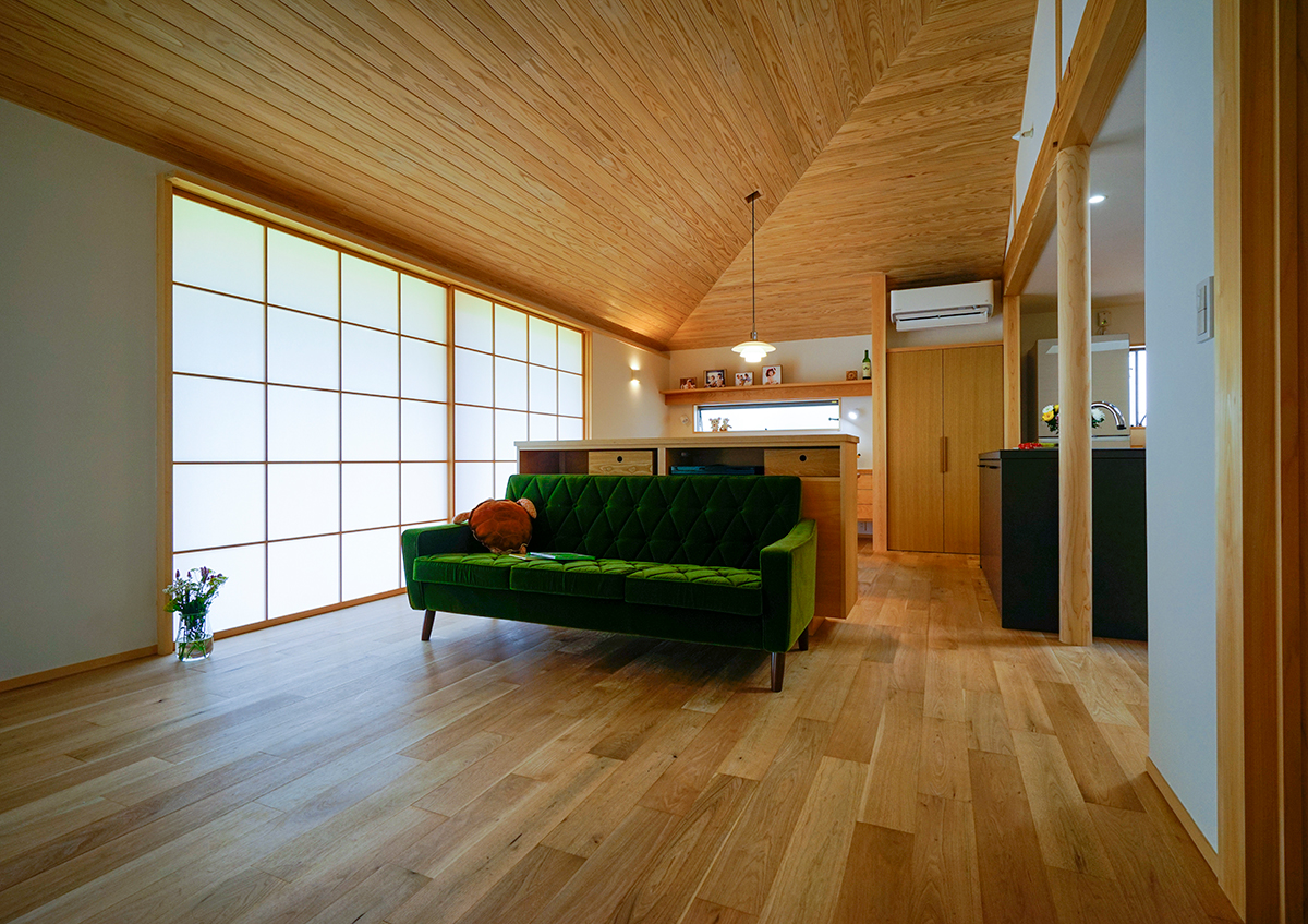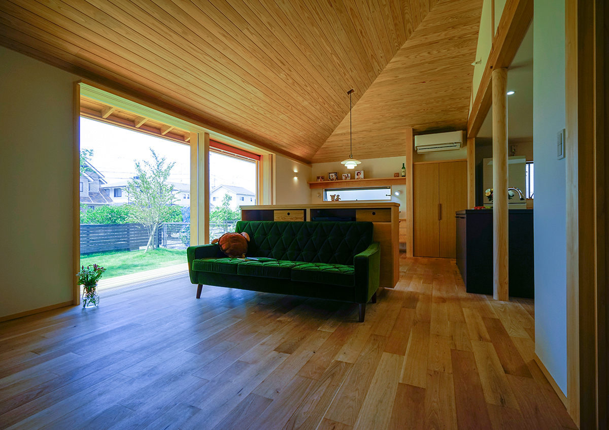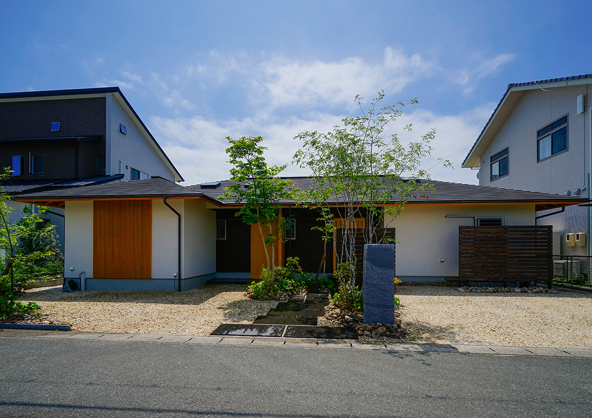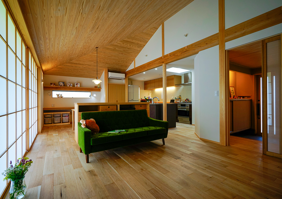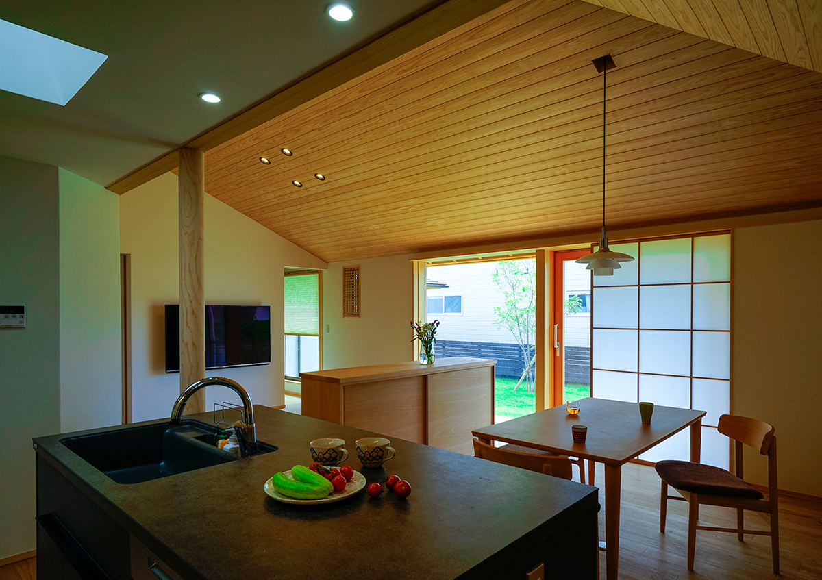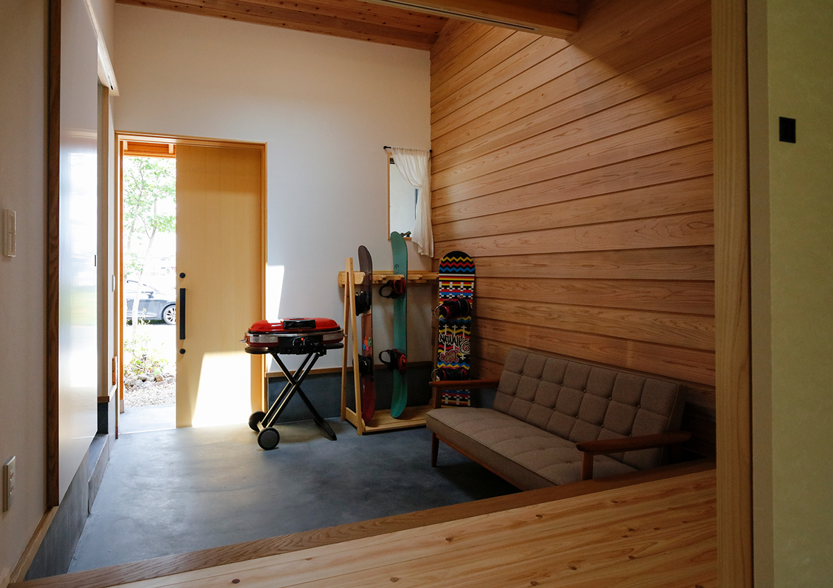 湖岸の住宅地に完成した「灯香の平屋」。「家を楽しむ」というコンセプトに沿って、楽しい時間を演出する工夫や仕様を随所に施しました。例えば、その時々で思い思いに自在に使える融通無碍な畳スペースがロータリーになって、その周りをグルグルと回遊できる楽しい間取りとしました。また、この畳スペースは小上がりなので、ベンチとしても利用でき、のんびり座って庭を眺めることが出来ます。その他、ご夫婦共通の趣味であるスノーボードのメンテの場として土間を設け、そこにソファーを置いて趣味室としても活用するなど、家の中にいくつもの楽しい空間を設えました。