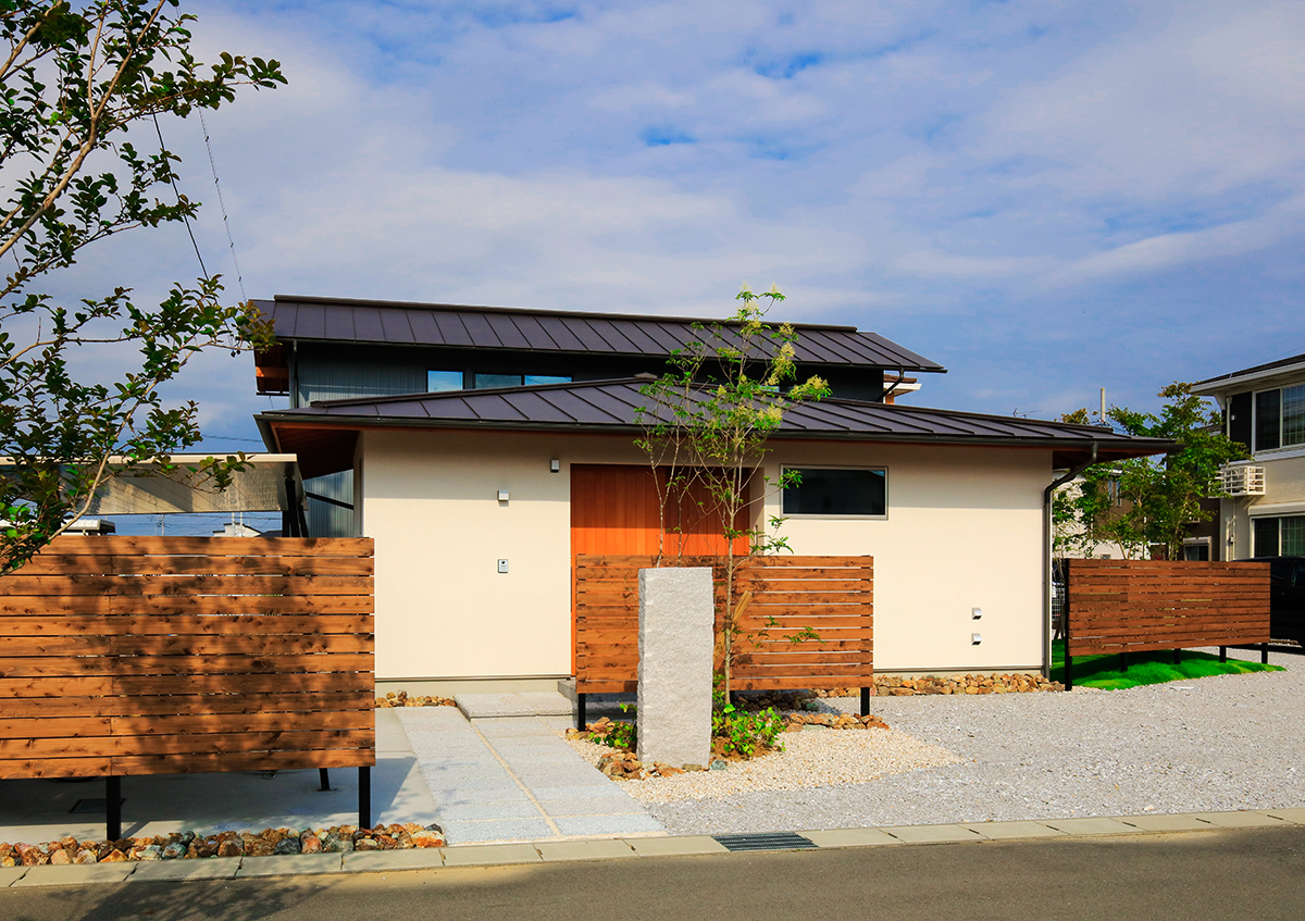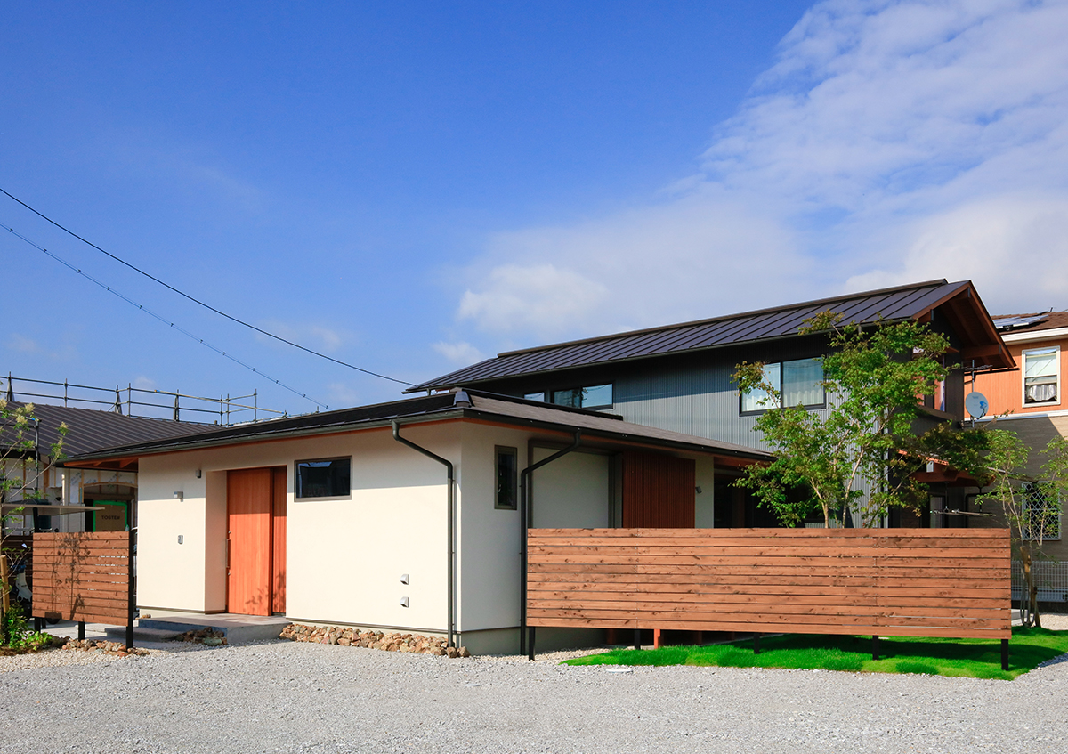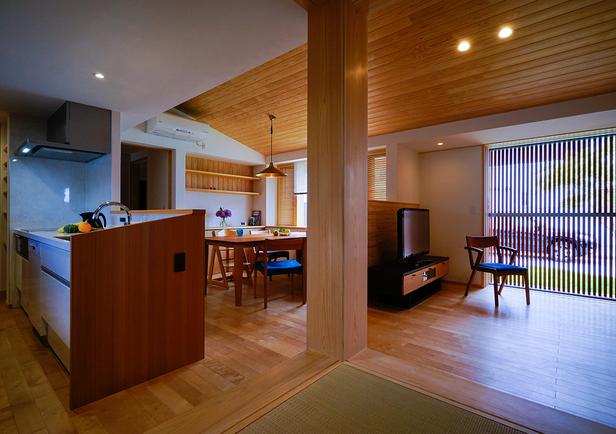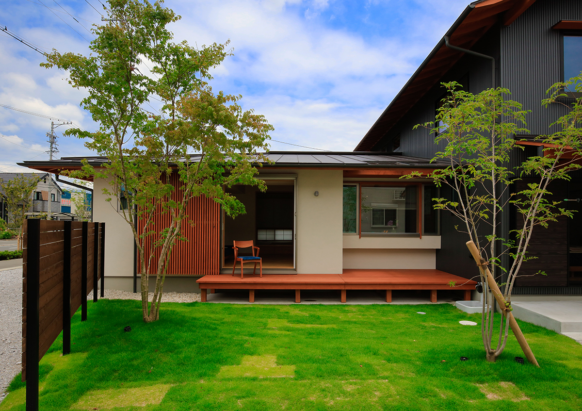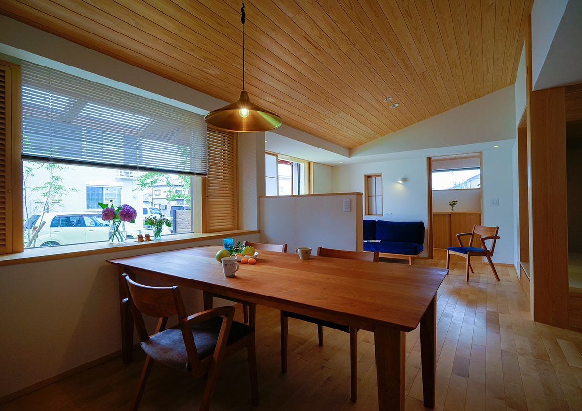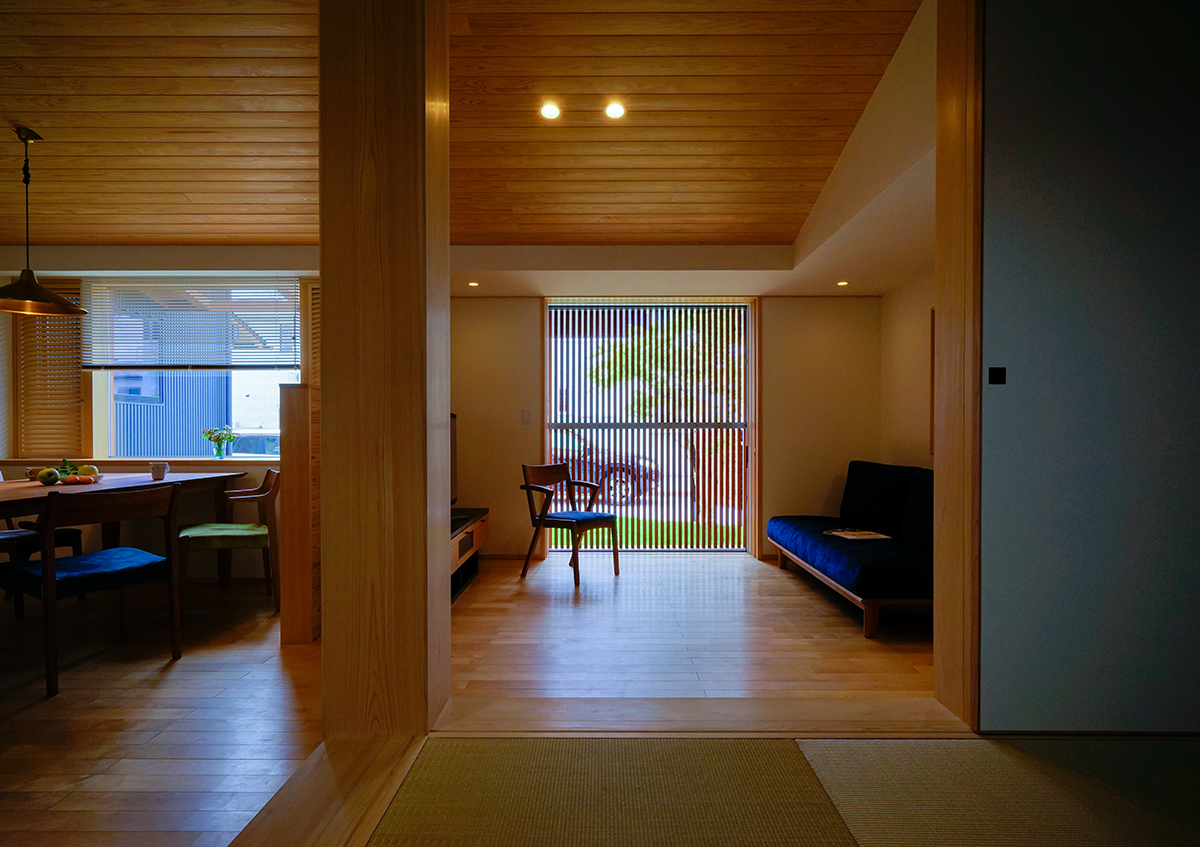 道路に面して平家部分、奥に 2 階部分のある 5 人暮らしの お住まいです。 「窓を装う」という名の通り、居間の窓には縦格子戸、障子、 ルーバー建具、ブラインドを取付け、季節や時間、ふるまい に応じて室内の明るさや風通し、視線を調節できるような 設えとしています。また、水廻りや寝室、クローゼットは 1 階に設け、将来は 1 階だけで生活が完結する間取りとして います。居間の窓は大地とつながり、芝や庭木の緑を感じ ながら暮らしています。
