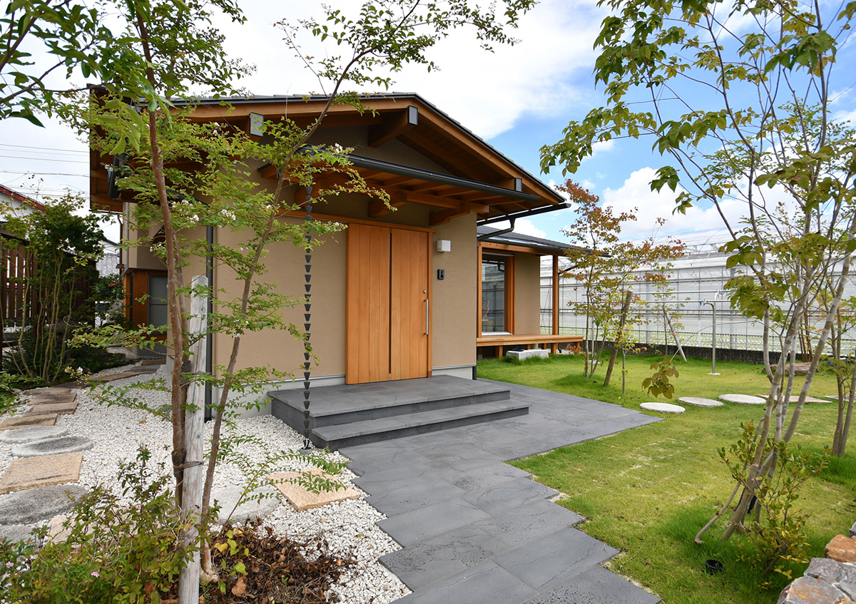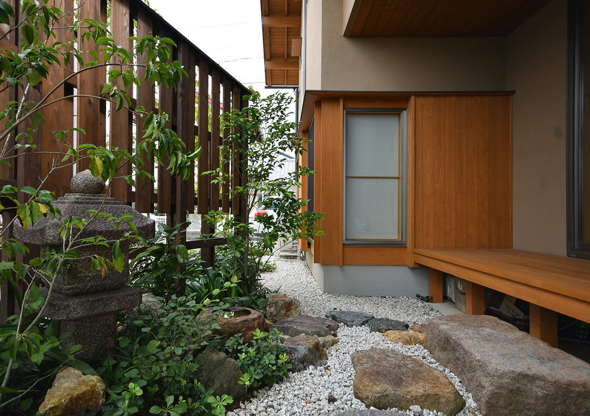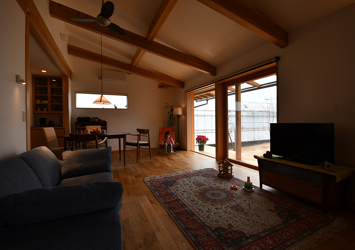 奥様のご実家の隣に、日本の家でありながら、ご主人の故郷から引き継いたイギリスやアメリカの古い家具が合う家をということで和風すぎず、でもどこか和の雰囲気を感じる家というテーマで設計がスタートしました。海外からのゲストが数日過ごす和室は、庭を眺めたり、座ってくつろいだりする空間となっています。二階をオーバーハングさせ、屋根の下の低い空間を利用した趣味室では、読書や、お気に入りの絵、旅先で見つけたカーペットや布を飾った空間となっています。災害時にはガス発電と、太陽光発電と蓄電池を備えることで停電時でも通常通りの暮らしができるようにしています。
