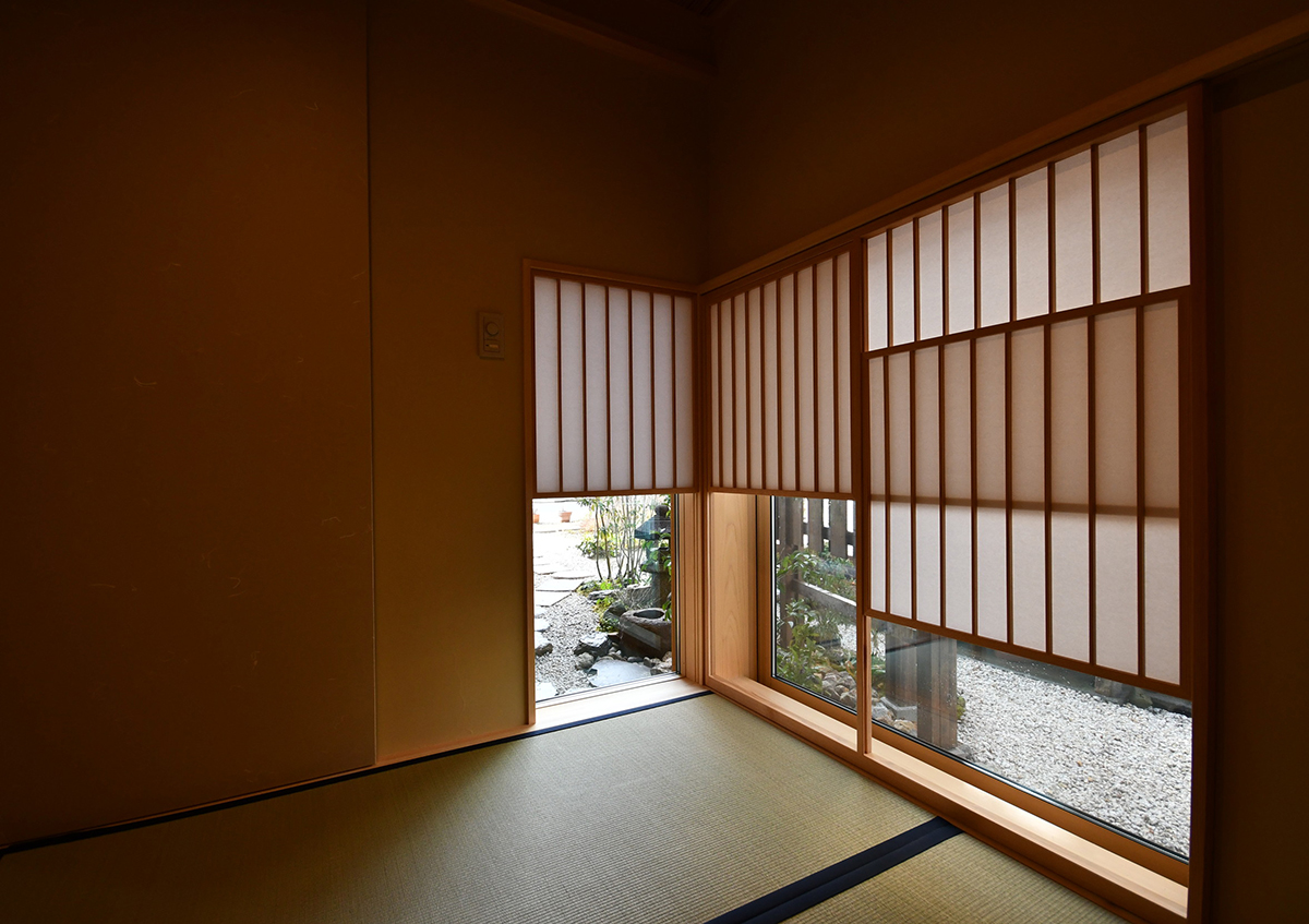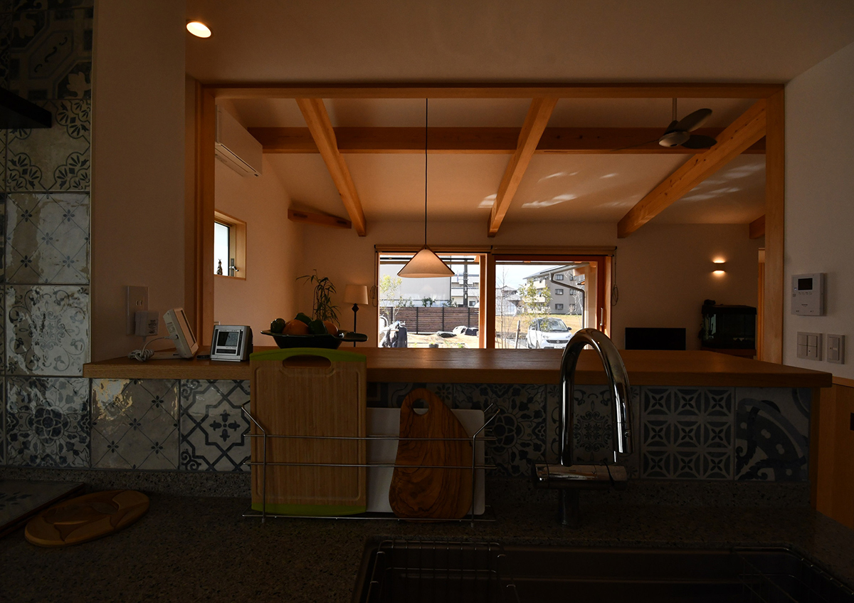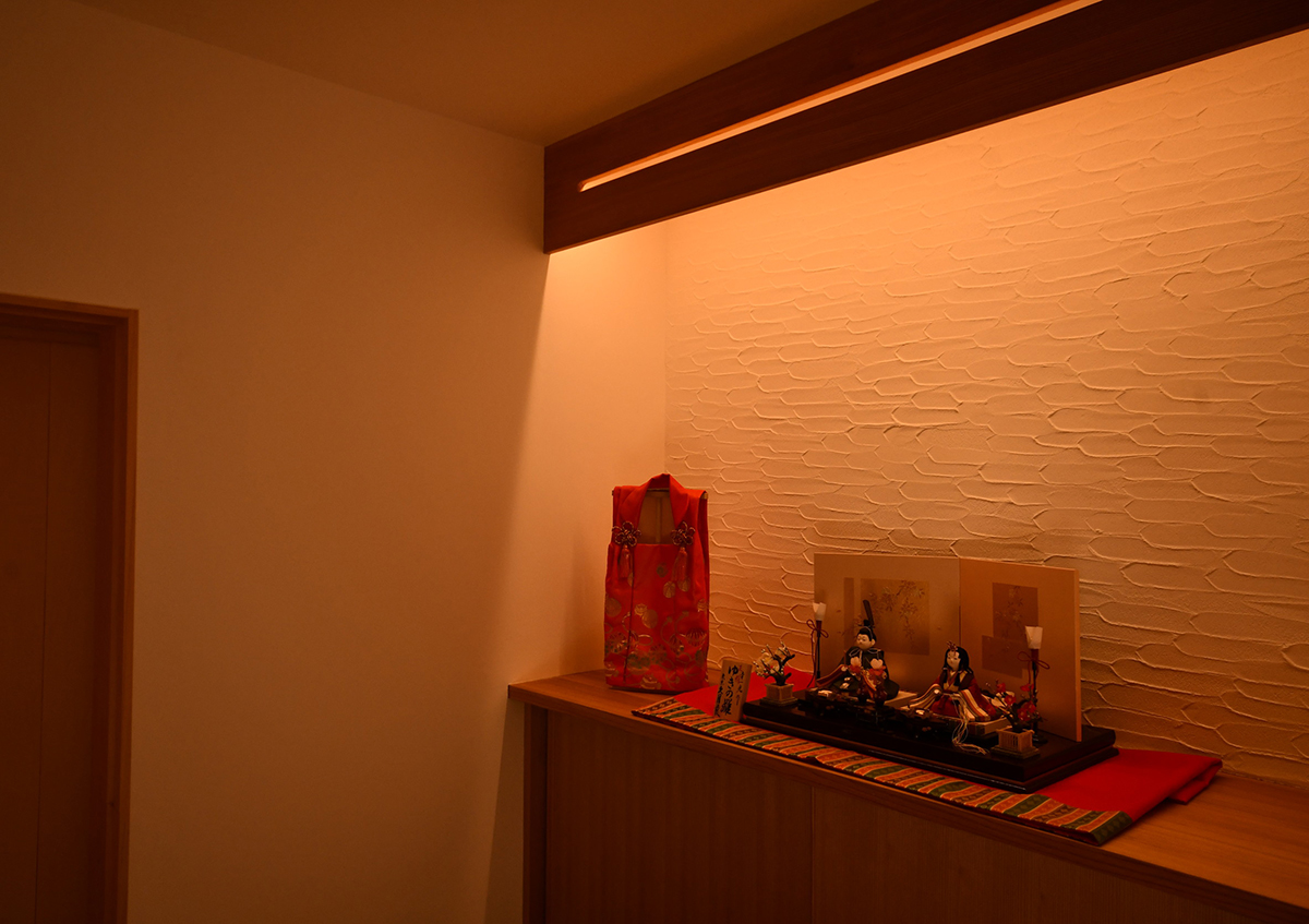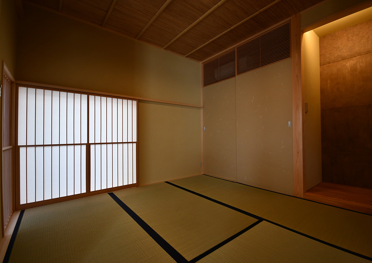 奥様のご実家の隣に、日本の家でありながら、ご主人の故郷から引き継いたイギリスやアメリカの古い家具が合う家をということで和風すぎず、でもどこか和の雰囲気を感じる家というテーマで設計がスタートしました。海外からのゲストが数日過ごす和室は、庭を眺めたり、座ってくつろいだりする空間となっています。二階をオーバーハングさせ、屋根の下の低い空間を利用した趣味室では、読書や、お気に入りの絵、旅先で見つけたカーペットや布を飾った空間となっています。災害時にはガス発電と、太陽光発電と蓄電池を備えることで停電時でも通常通りの暮らしができるようにしています。