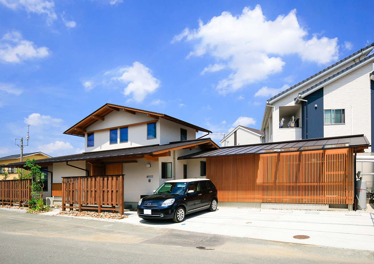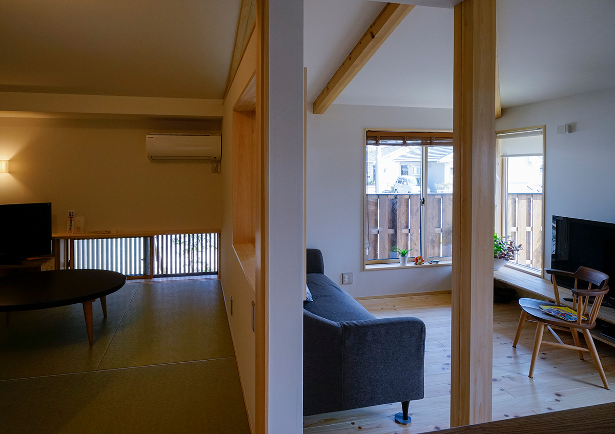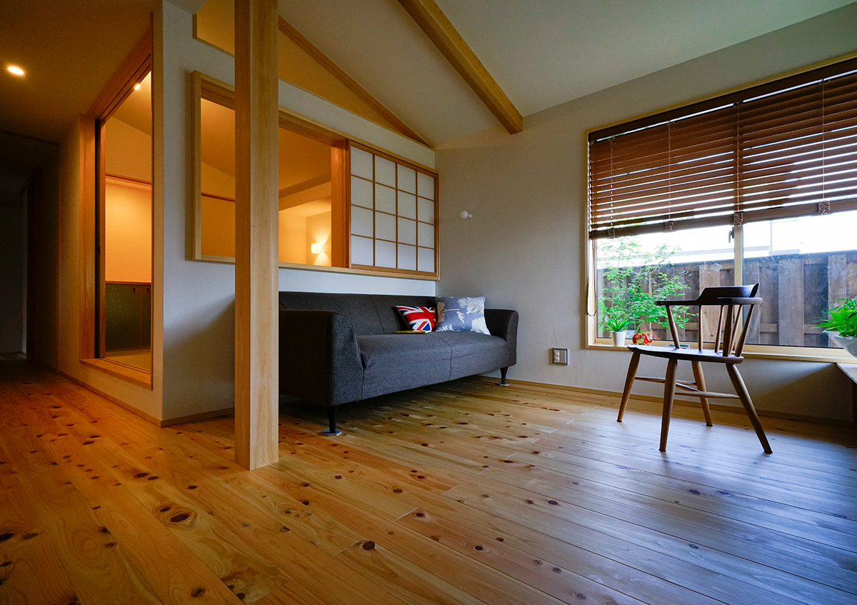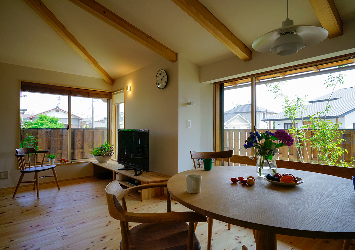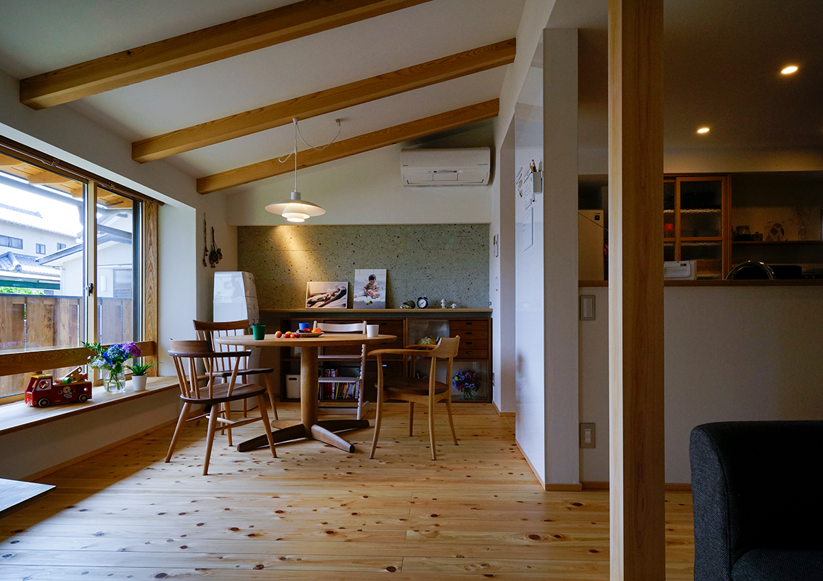 家族の思い出を写真に撮って記録することがお好きなご夫婦の家です。60坪程の広さで、南北が長く東西が短い形をした南東の角地。平屋暮らしが出来るよう、子供室以外は全て1階に纏めた2階建て。外部はすぐ近くに大きな公園があるため、少しの植栽と駐車場スペースのみとしました。またダイニングには出窓風の造り付けベンチや大谷石貼りの壁、お子さんの作品が貼れるマグネットボードなどを設け、リビングダイニングの居心地を高めるように工夫しました。また玄関からリビングに抜ける廊下の一角には、壁一面に家族の思い出の写真が飾れるコーナーをつくり、大切な家族の思い出をいつでも思い出せるようにしました。幸記の家とは、喜怒哀楽、様々な生活の場面が家族の掛け替えのない思い出になり、それらがこの家に一つ一つ記されていく家にとの想いで名付けました。