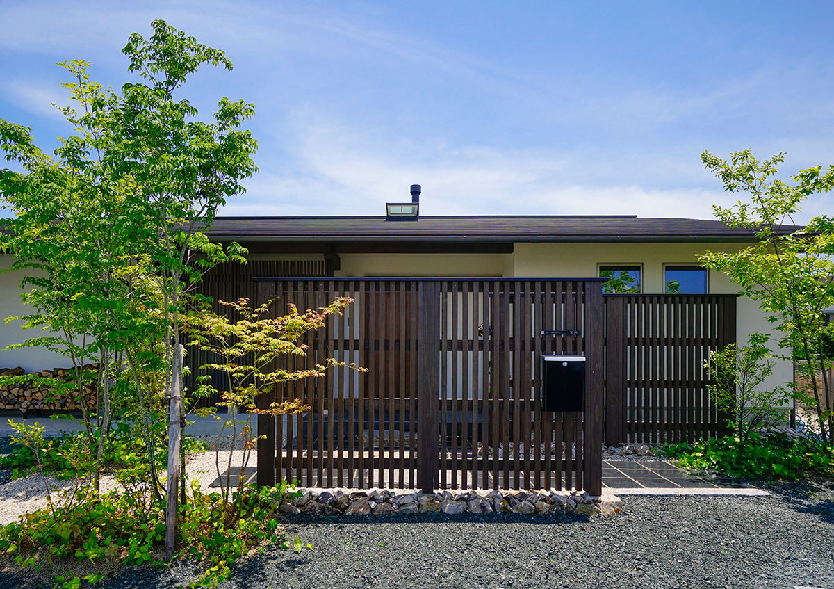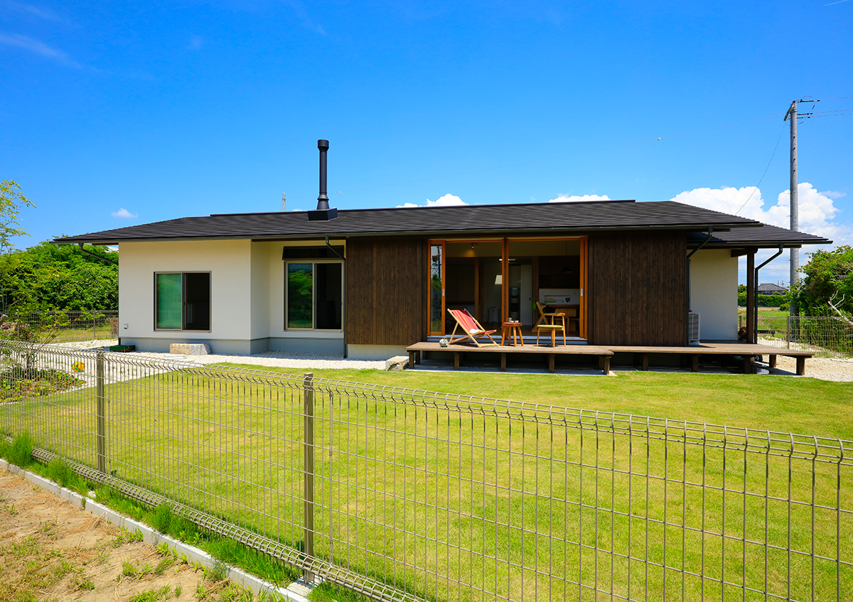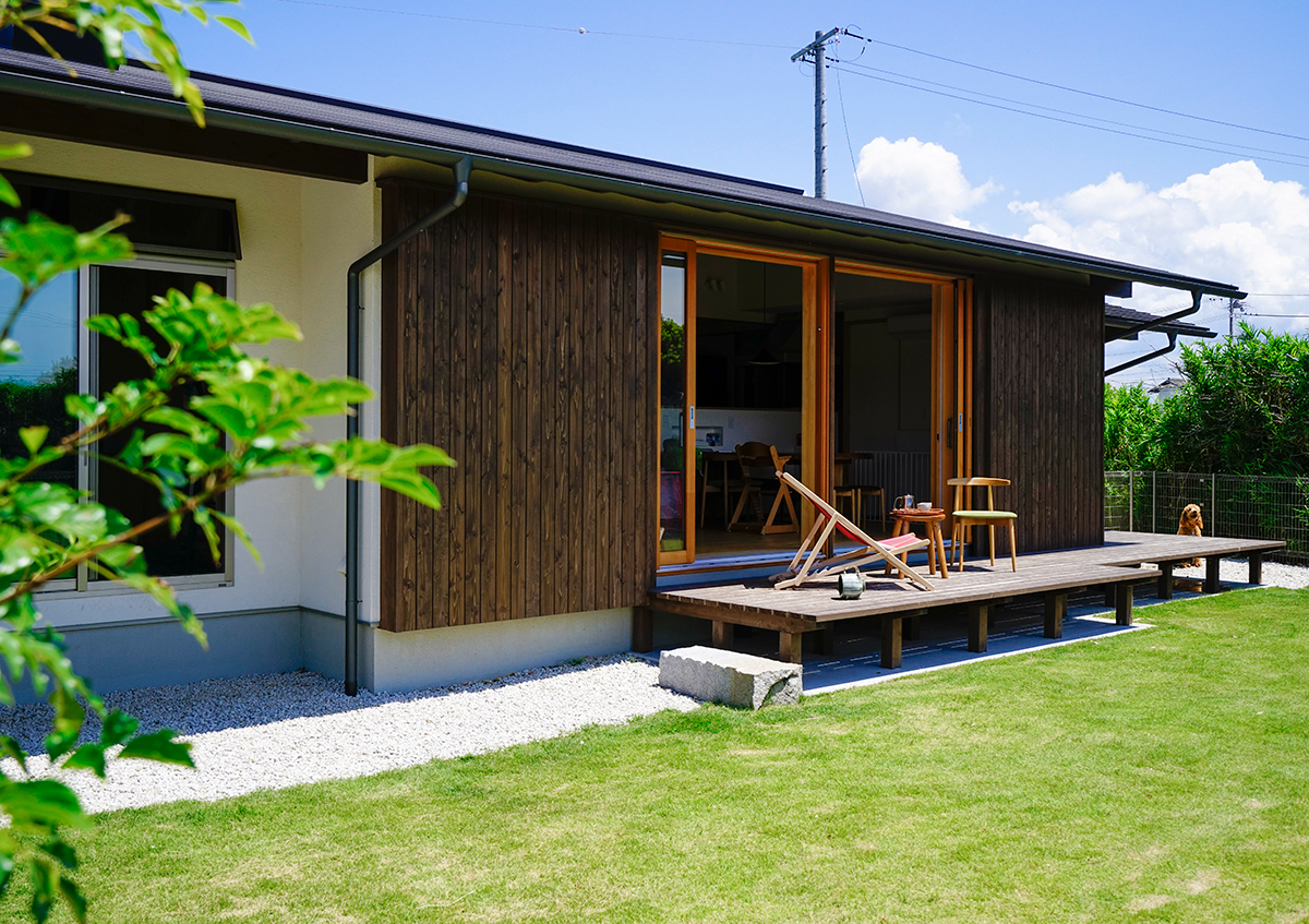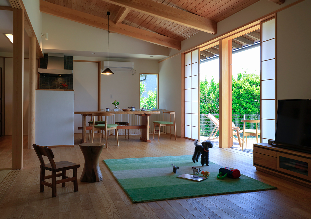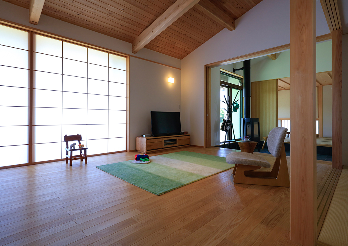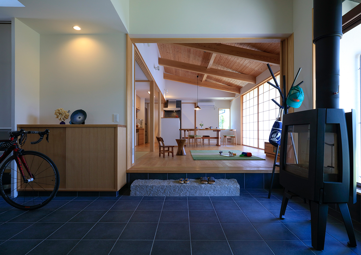 静かな田園風景の中にある家族と愛犬が暮らす平屋です。玄関からつながる中央の土間にはマキストーブが設置され、火を眺めながら飲むお酒。土間を走る愛犬。友人達と火を囲んで過ごす語らう楽しい時間。趣味の自転車を飾り、休日にはメンテナンスをしたりと多目的な空間となっています。南に建つアパートの視線を気にせず過ごせるよう、配置角度を調整することで、大きな木製サッシから外の景色を見ながら障子を閉めることもなくオープンに過ごしています。たくさんの要素がありながら、住まい手にとってちょうどいい家となれば幸いです。