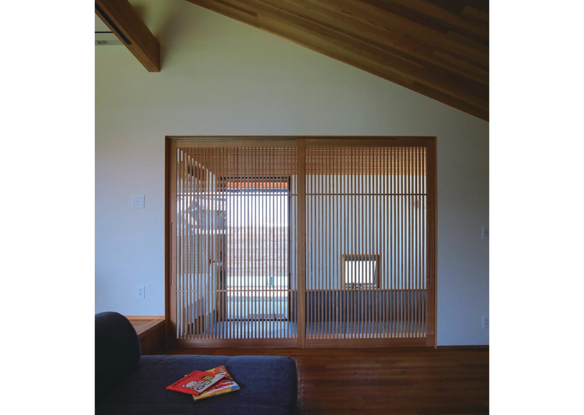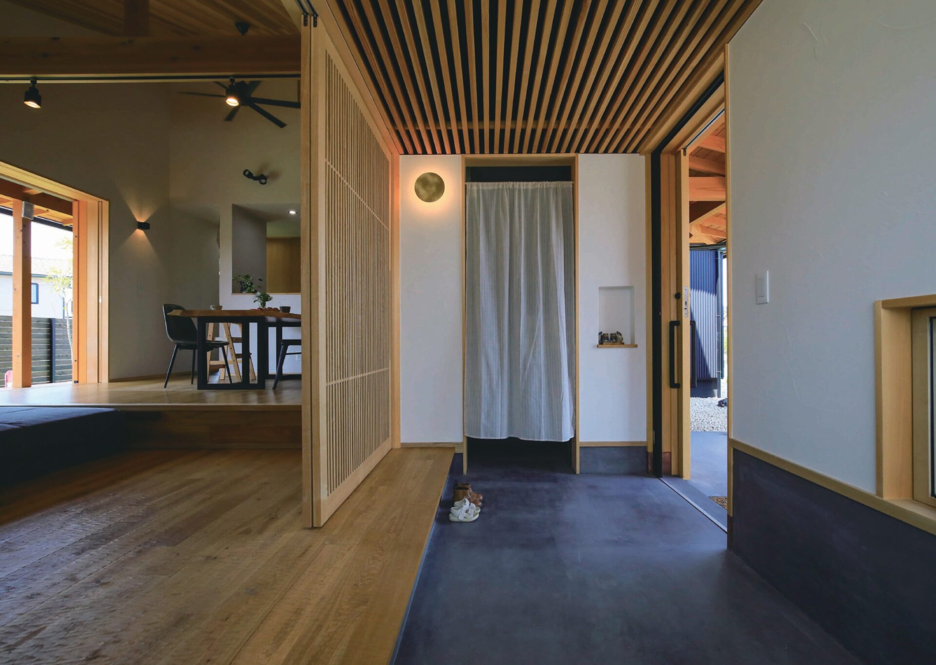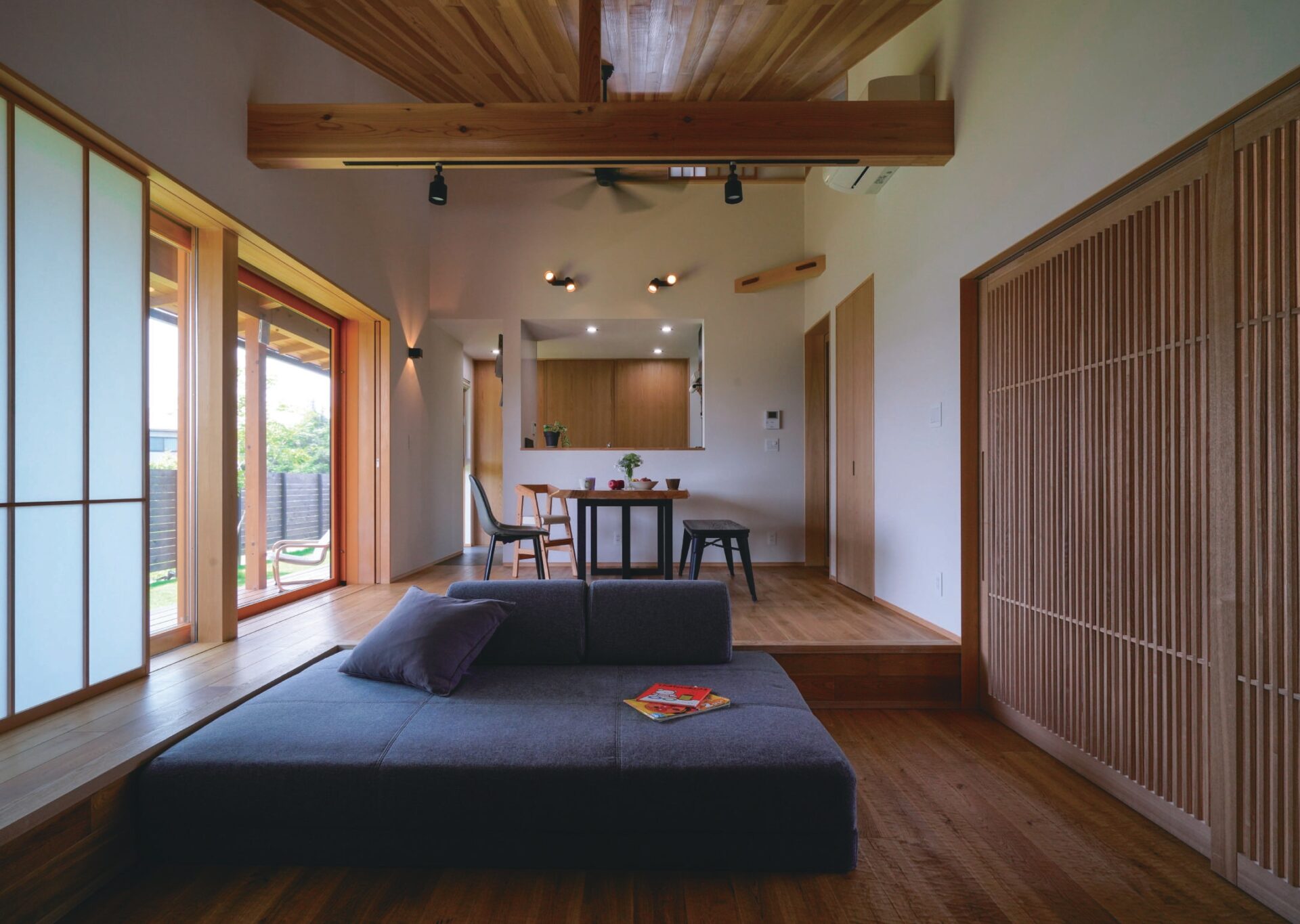 一段高さを下げたリビング空間は土間とつながり、ずっとそこに居たくなるような落ち着いた空間となっています。