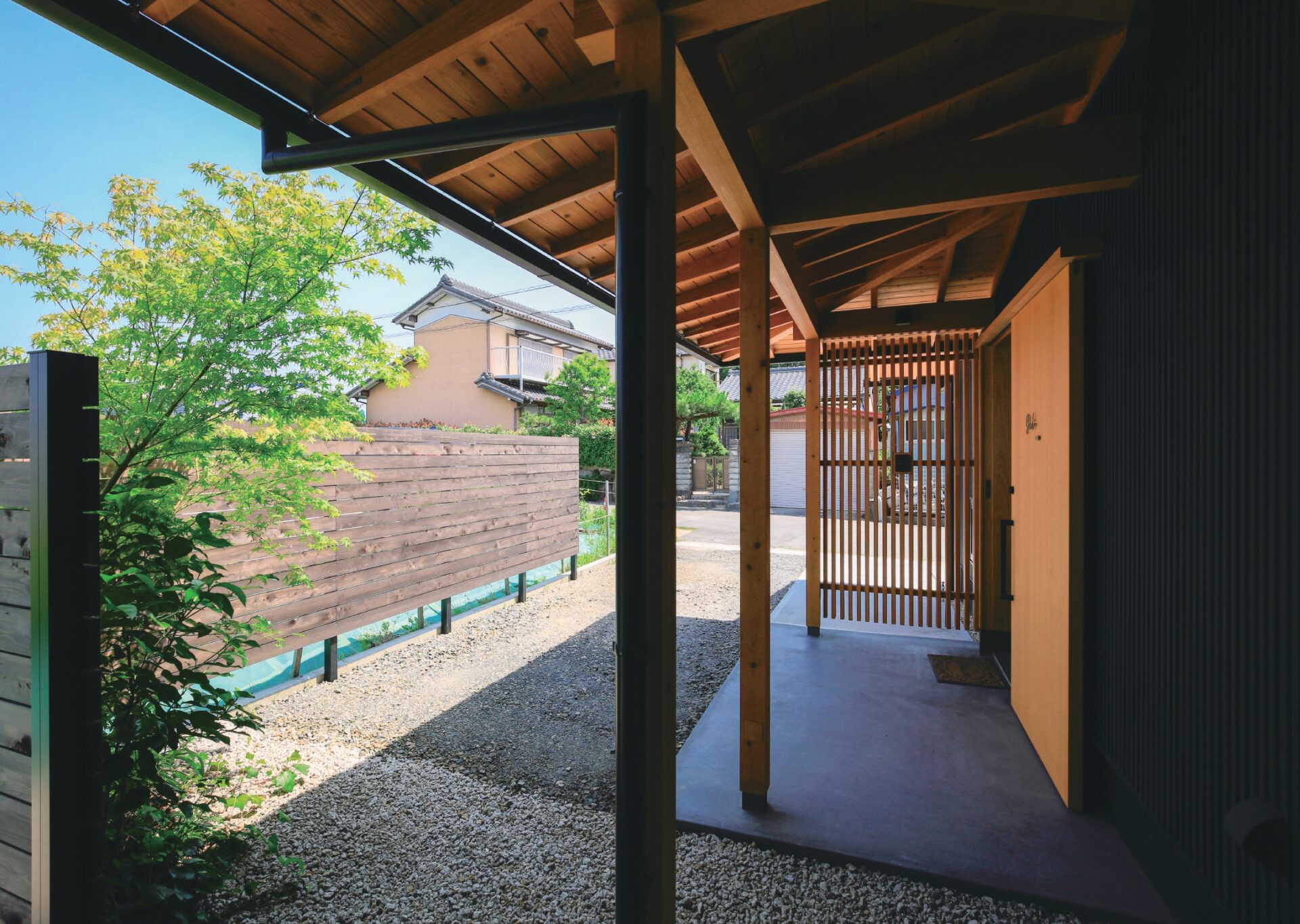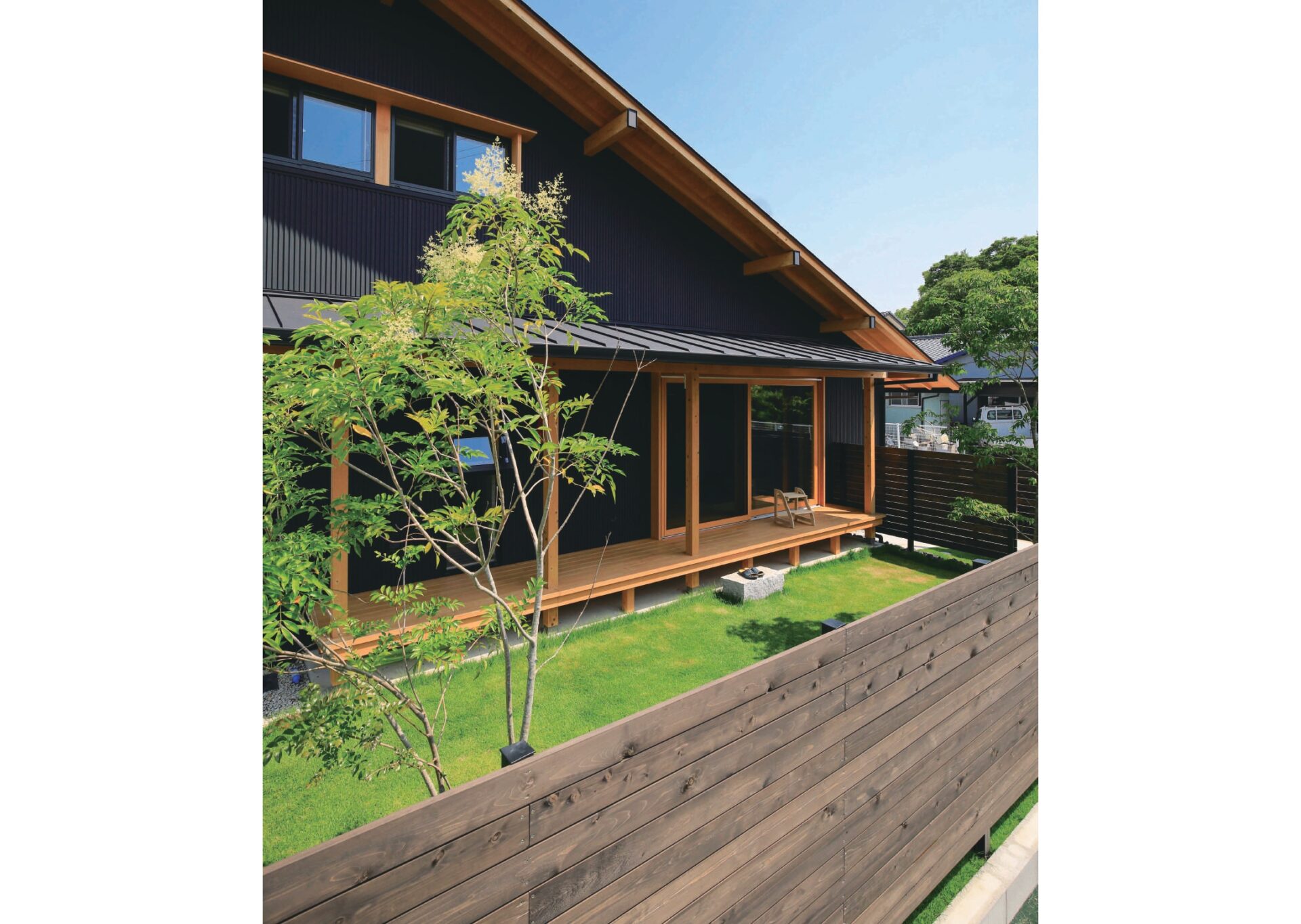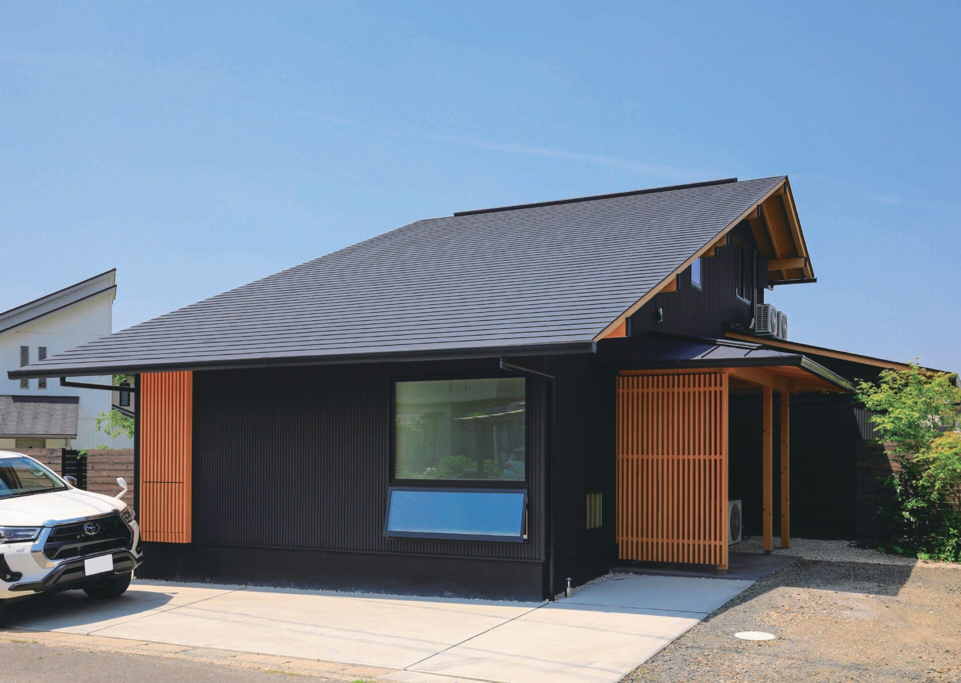 外部は黒のガルバリウムやサッシで黒でまとめることでとてもシャープな印象を醸し出していますが、木製サッシやその他の木の色がポイントになり優しさも感じられるデザインにしています。