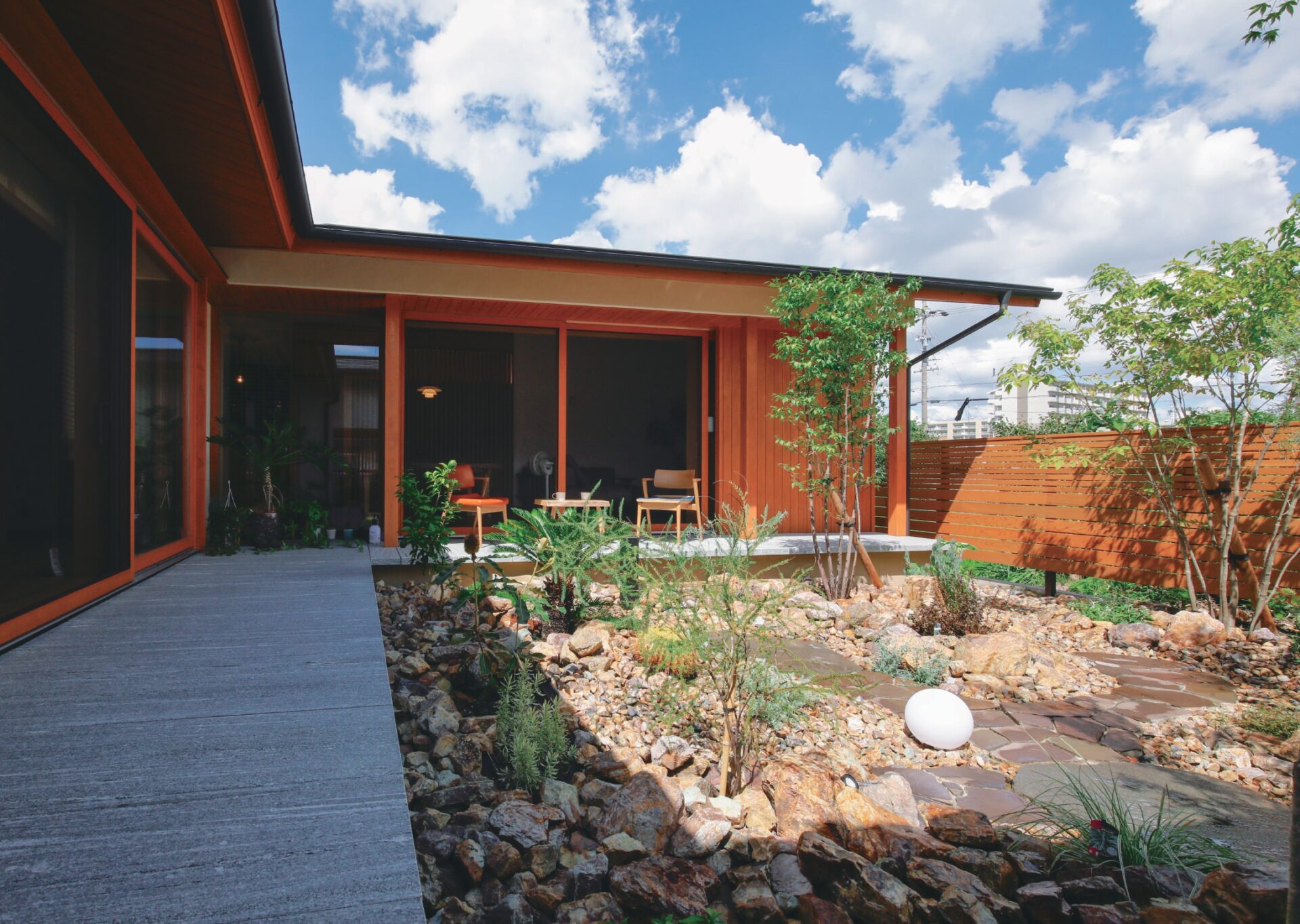 内部空間は、木製サッシの大開口により、石のデッキ越しに少々異国風なしつらえの中庭とつながり、光や風を感じるとても落ち着いた心地良い空間となっています。