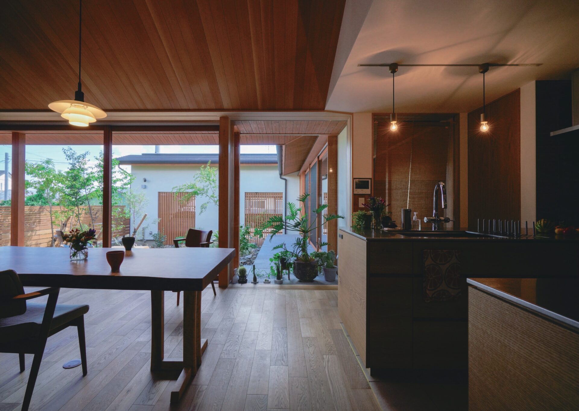 周囲の視線を感じることなく落ち着いて暮らすために、道路側のガレージとリビング空間の間に中庭をつくり、コの字の平屋として計画しました。