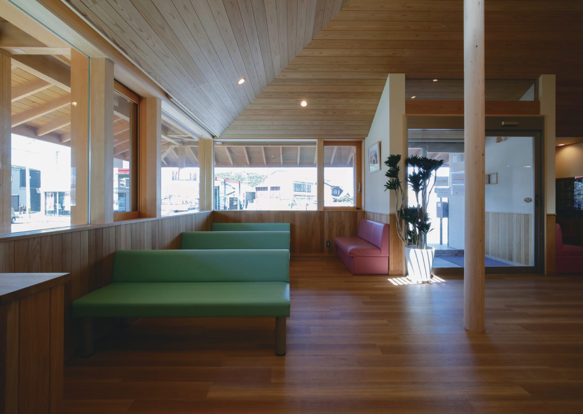 待合室の内部空間は、屋根の形に合わせた開放的な吹き抜け空間が広がります。