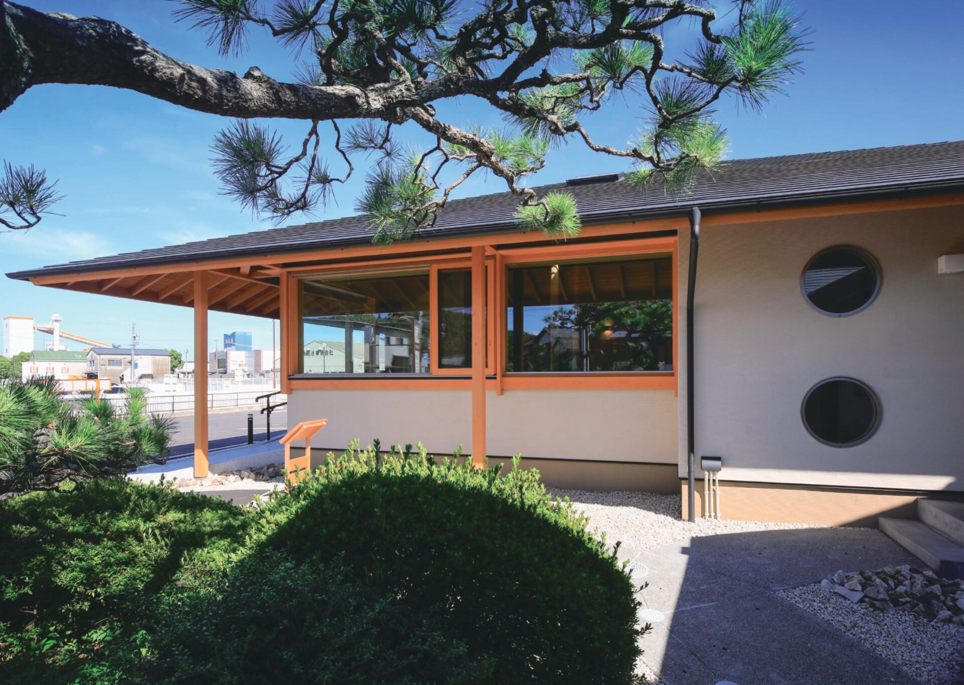 外部デザインについては、大きな軒の出と方形の屋根が特徴の建物です。
