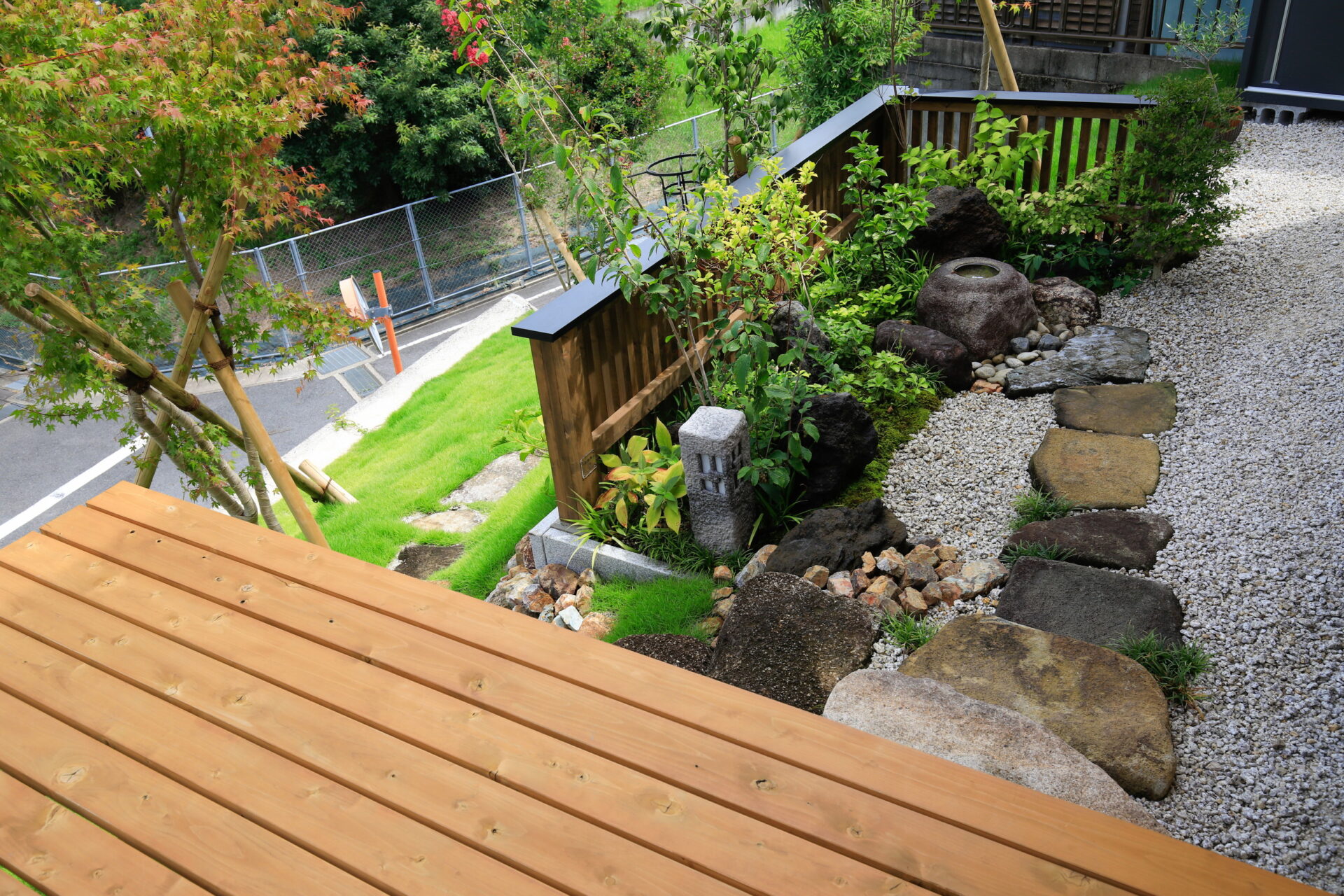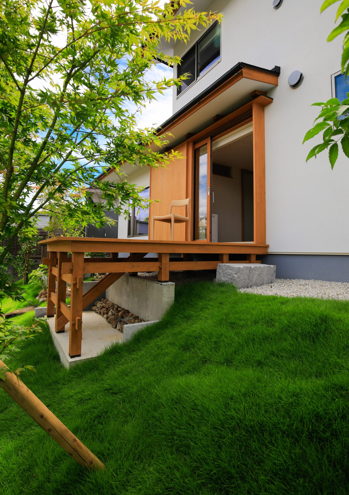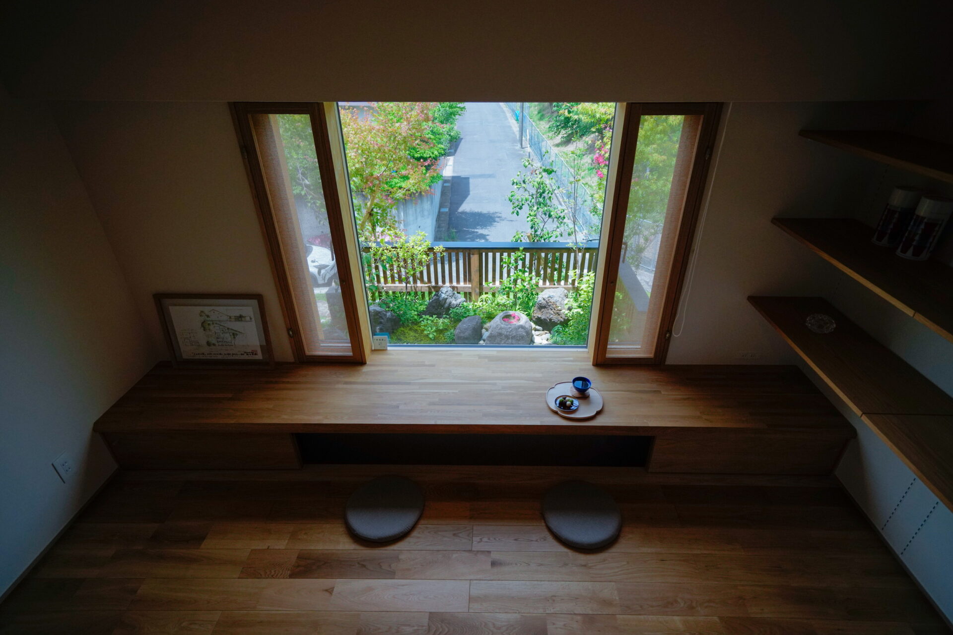 それにより残った北側の空地を北庭とし、樹木を植え、ダイニングの大開口から延びるデッキで北庭の斜面まで出ていける様にしました。