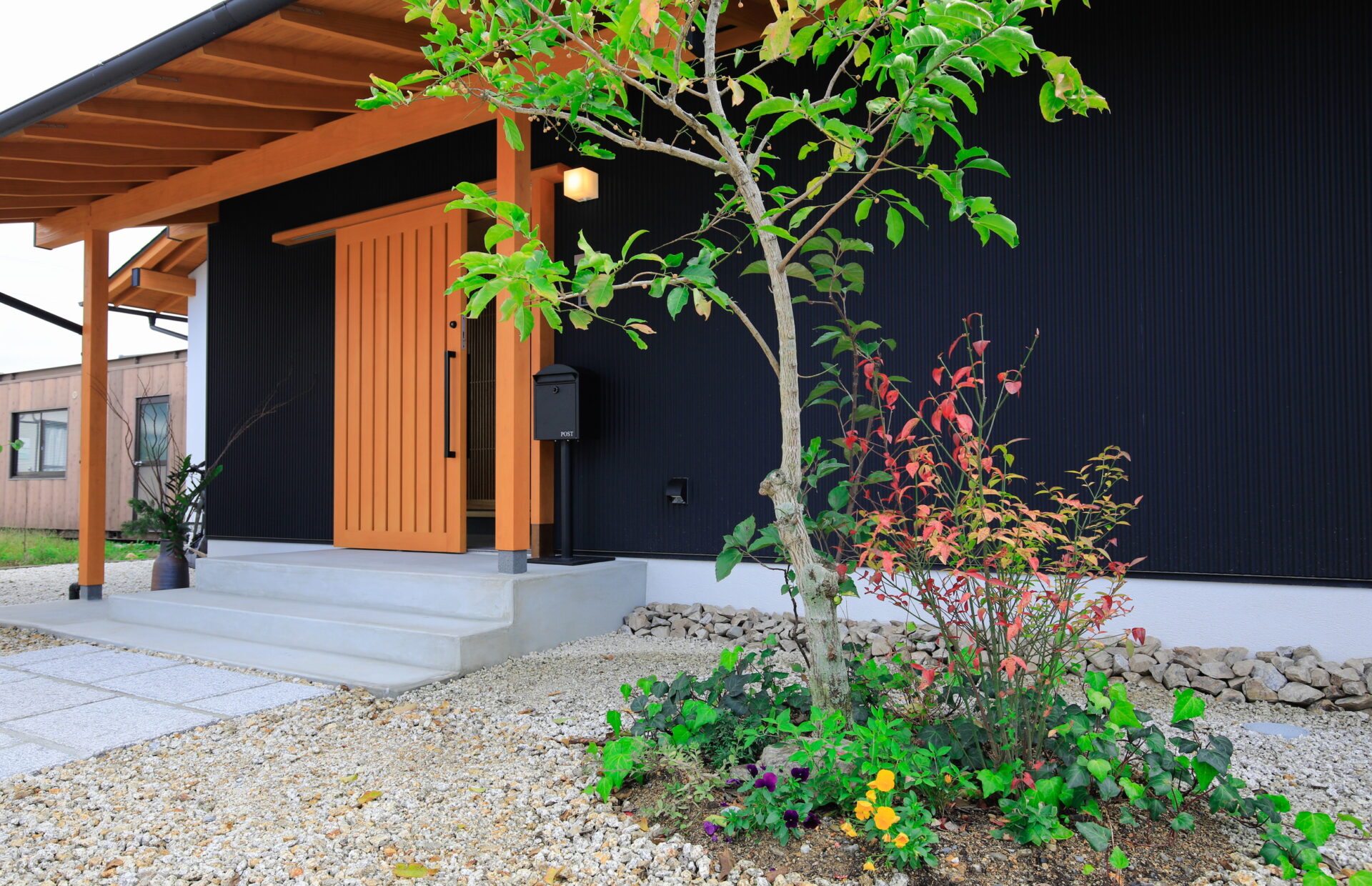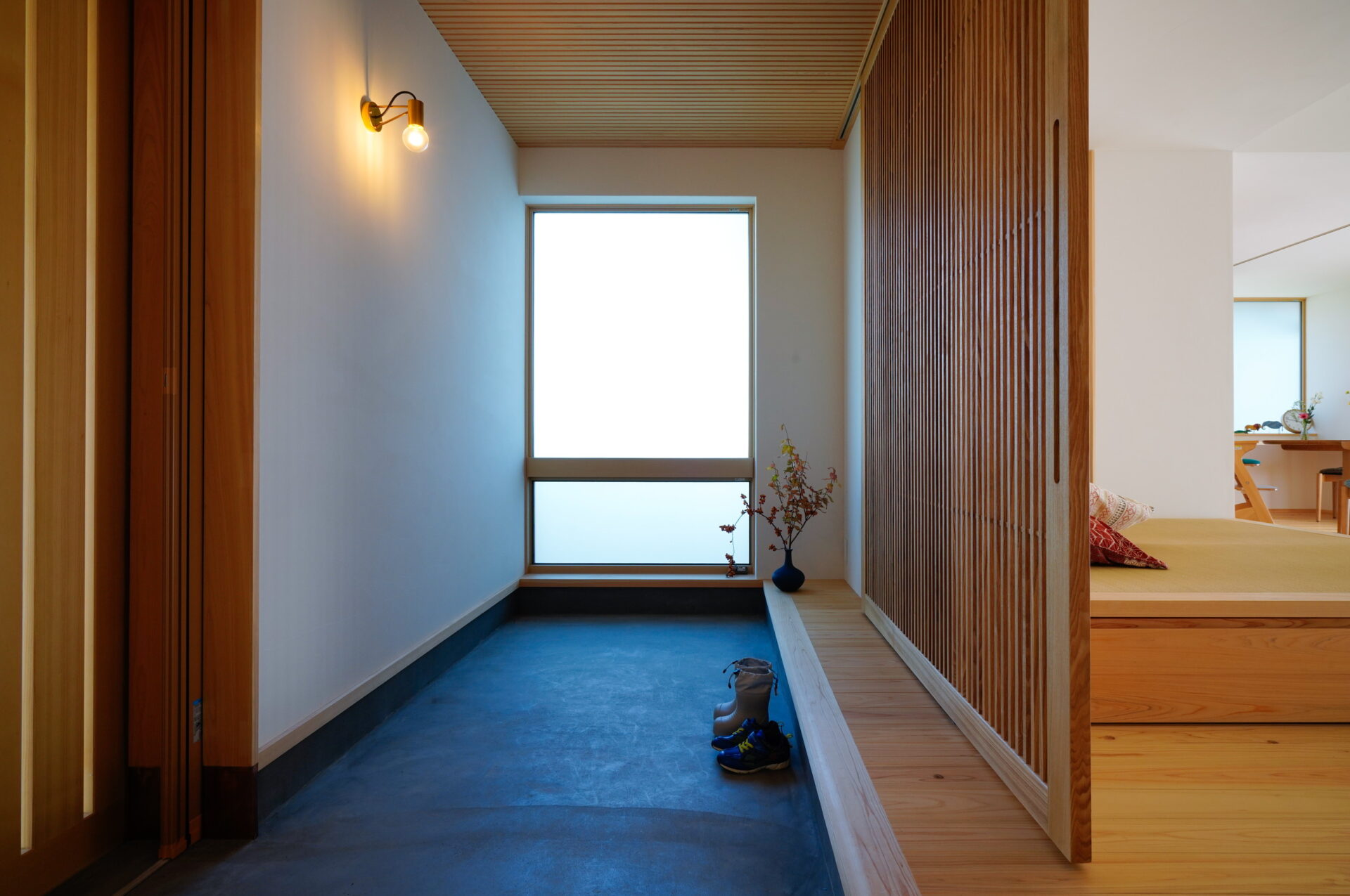 北側の大きな軒下から入る玄関アプローチは軒が低く大きく張り出し、街の風景を彩ってくれています。
