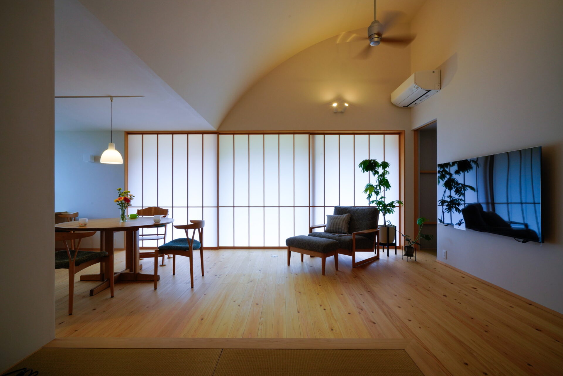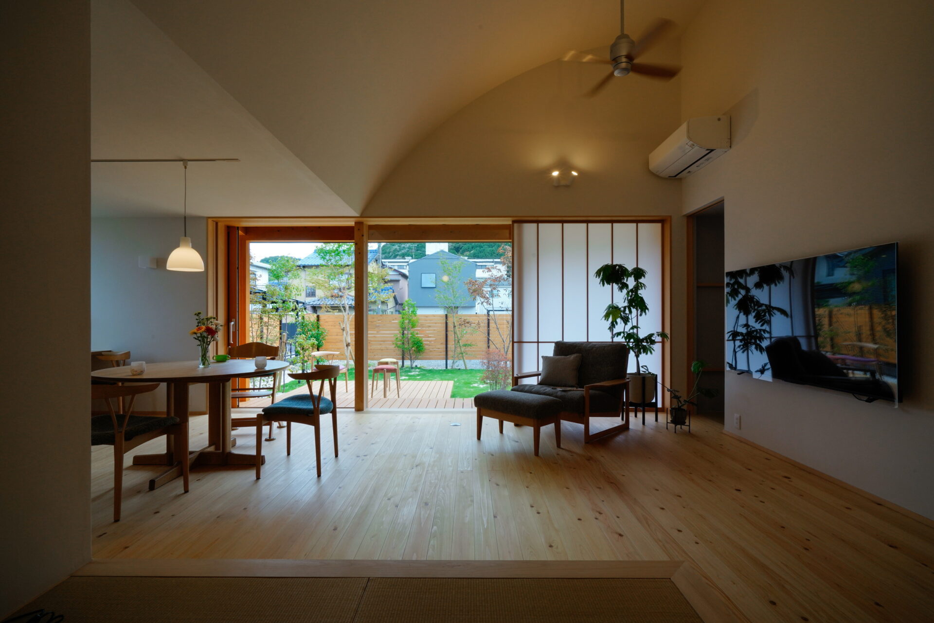 リビングの木製サッシの大開口とRの天井は開放的ながら、どこかやさしく包まれた印象を与えてくれます。